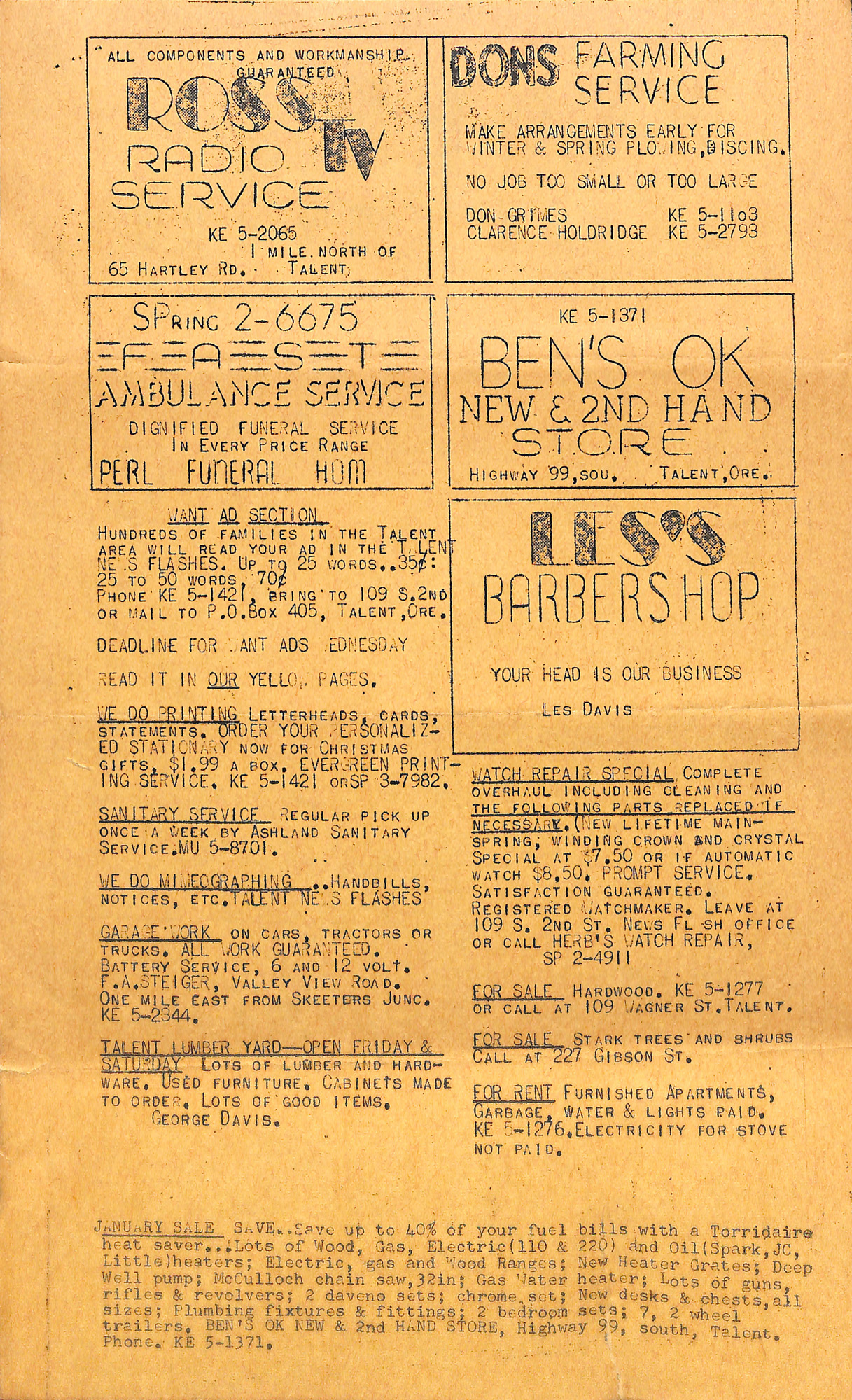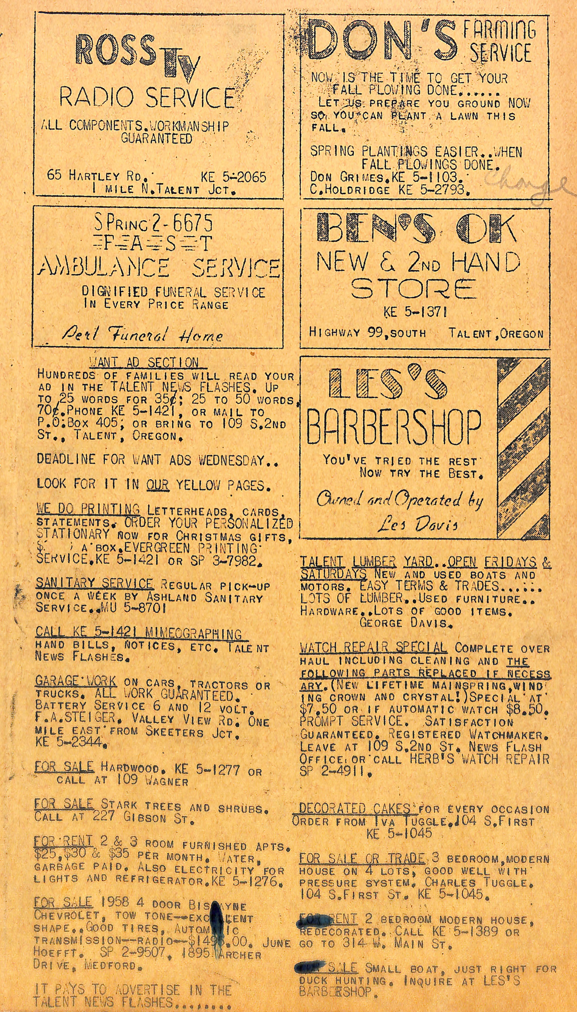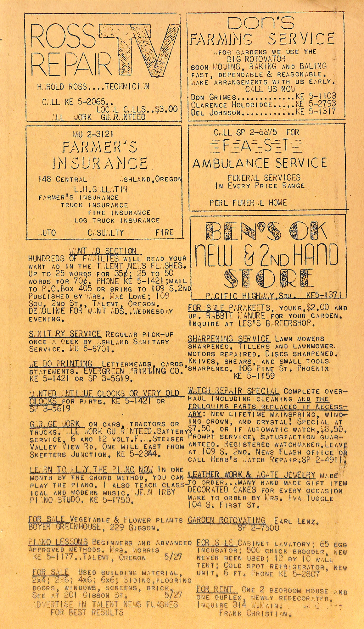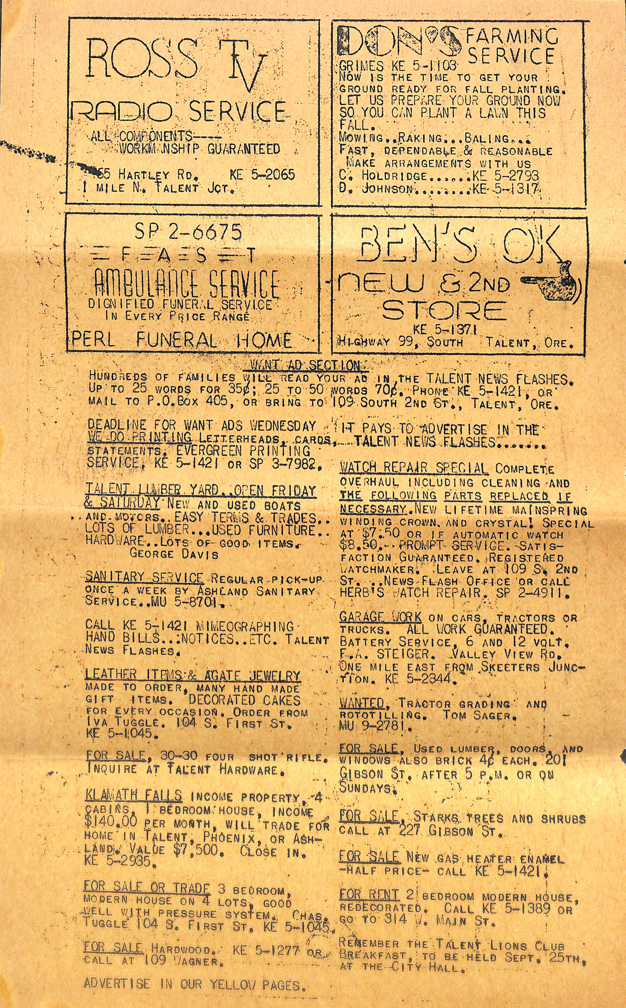 Page 5, ads for: ROSS TV & RADIO SERVICE DON'S FARMING SERVICE PERL FUNERAL HOME & AMBULANCE SERVICE BEN'S OK NEW & 2ND HAND STORE LES' BARBERSHOP WANT AD SECTION Hundreds of families will read your ad in the TALENT NEWS FLASHES. Up to 25 words for 35¢; 25 to 50 words for 70¢. Phone KE 5-1421, bring to 109 S. Second St. or mail to P.O. Box 405, Talent, Ore. DEADLINE FOR WANT ADS WEDNESDAY