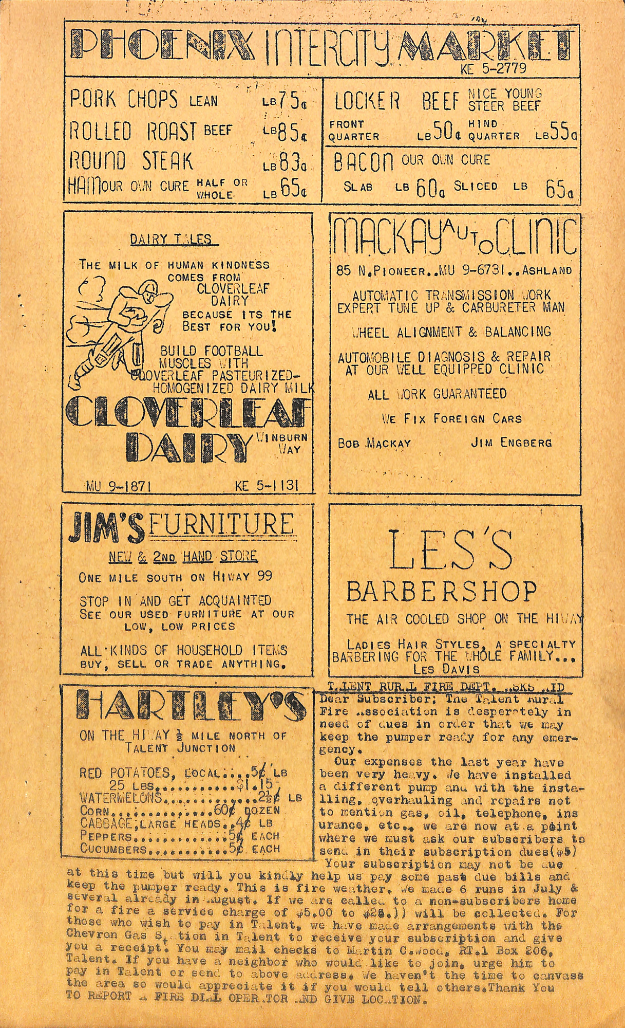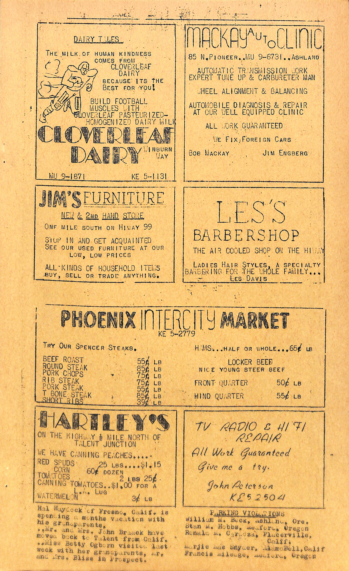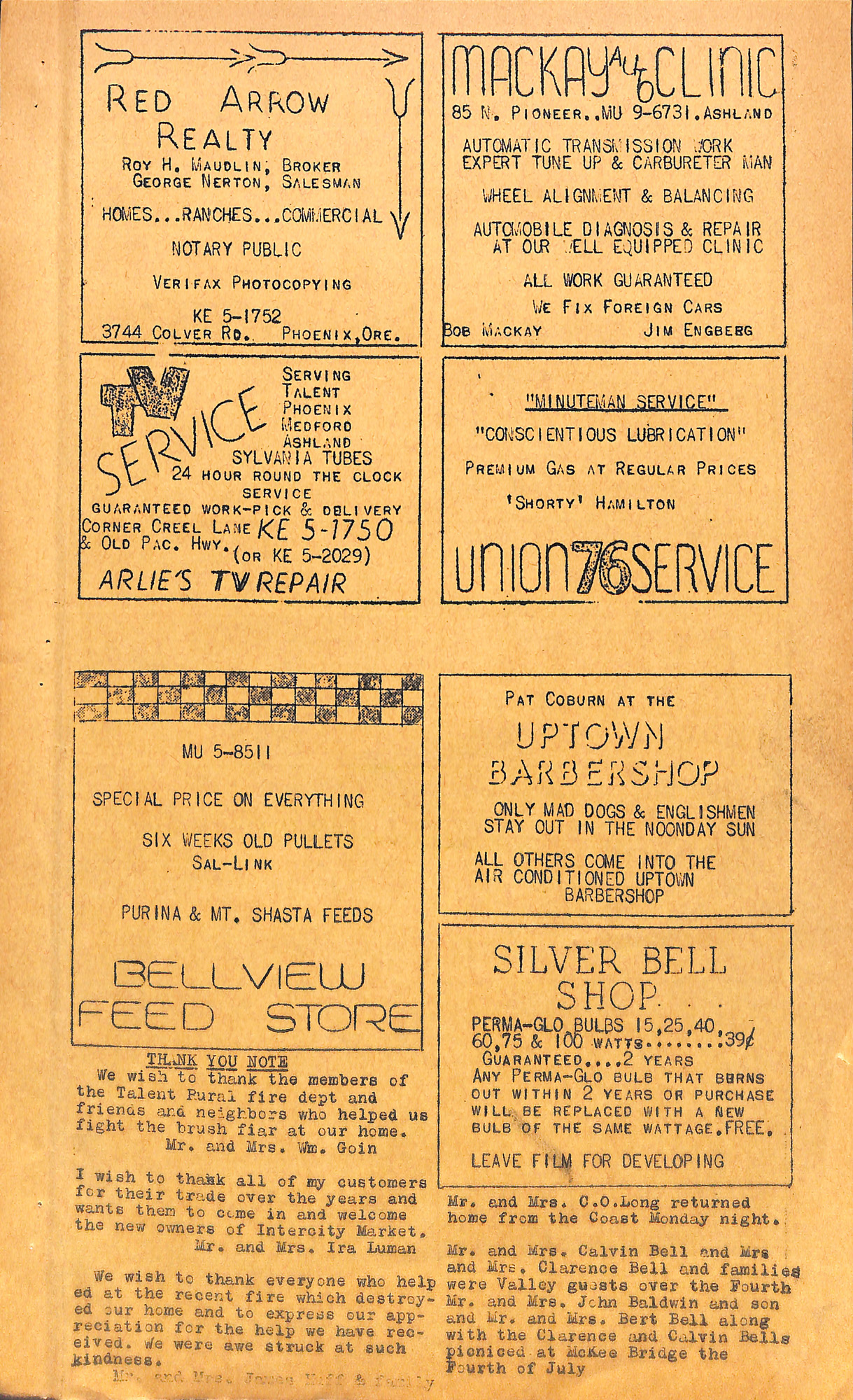 Thomas J. Reeder Nona McAbee, Municipal Judge M.W. Young, Talent Police. Page 2, ads for: THE ABATTOIR MACKAY AUTO CLINIC UNION 76 STATION JO'S CAFÉ BEN'S OK NEW & SECOND HAND STORE FOR SALE--Westinghouse refrigerator, 2 dinette sets, wood and metal. Nice flat top desk. Platform rocker upholstered. Speed Queen electric washing machine. Several miscellaneous articles. Phone KE 5-2348, old Colver Rd. Route 1 Box 312. Debbie Coffin ran in front of a bicycle ridden by Jimmy Cutburth, who tried to avoid her. She received minor bruises. She is the daughter of Mrs. Coffin, who teaches in the Talent schools. SILVER BELL GIFT SHOP