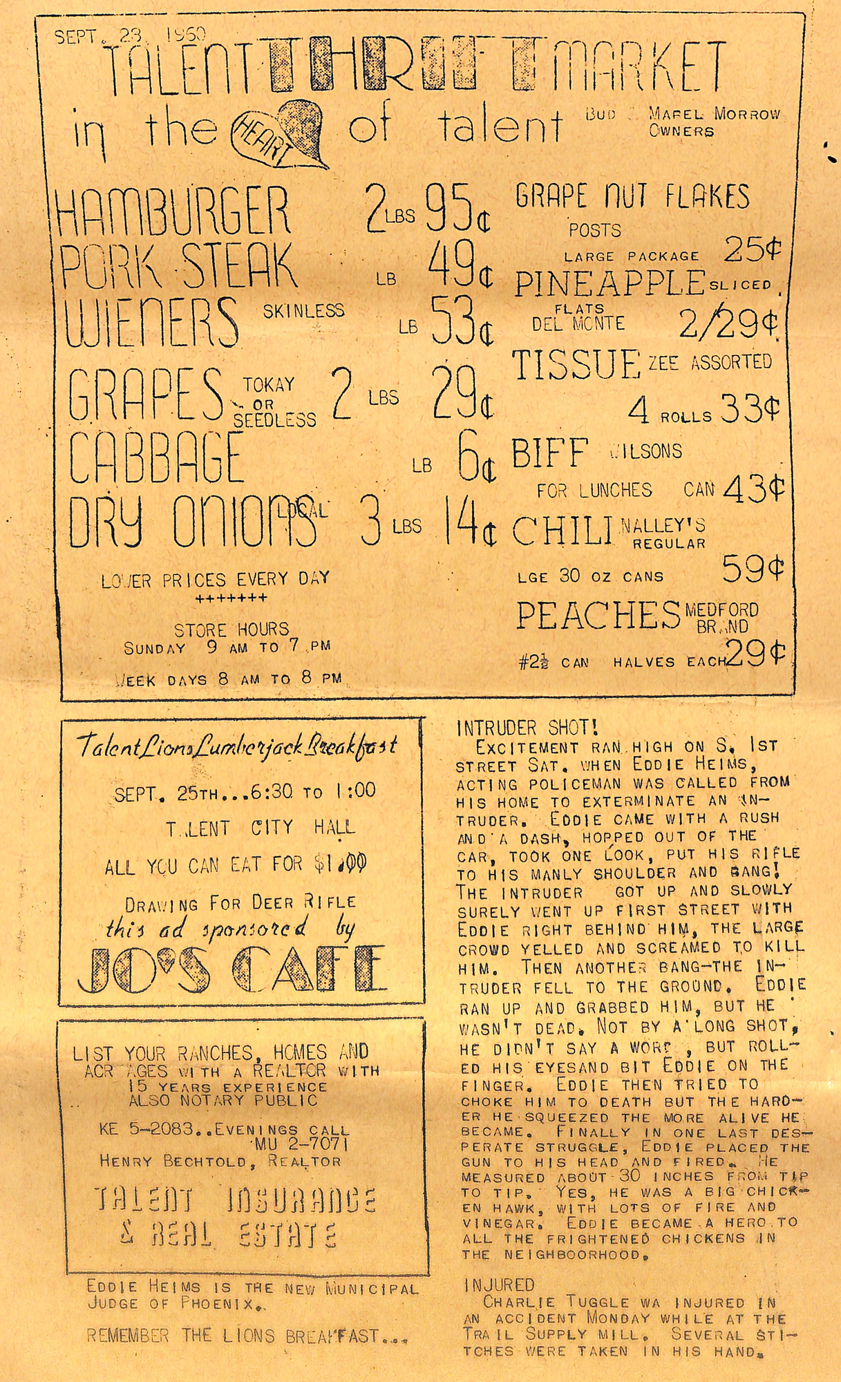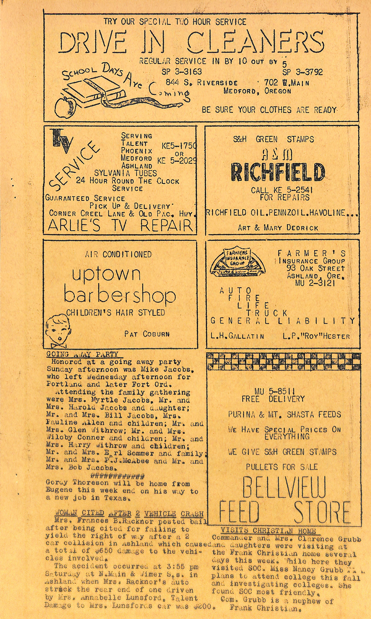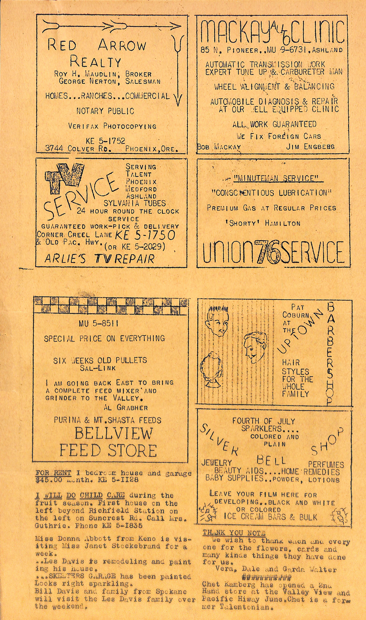 Thomas J. Reeder Nona McAbee, Municipal Judge M.W. Young, Talent Police. Page 2, ads for: THE ABATTOIR MACKAY AUTO CLINIC UNION 76 STATION JO'S CAFÉ BEN'S OK NEW & SECOND HAND STORE FOR SALE--Westinghouse refrigerator, 2 dinette sets, wood and metal. Nice flat top desk. Platform rocker upholstered. Speed Queen electric washing machine. Several miscellaneous articles. Phone KE 5-2348, old Colver Rd. Route 1 Box 312. Debbie Coffin ran in front of a bicycle ridden by Jimmy Cutburth, who tried to avoid her. She received minor bruises. She is the daughter of Mrs. Coffin, who teaches in the Talent schools. SILVER BELL GIFT SHOP