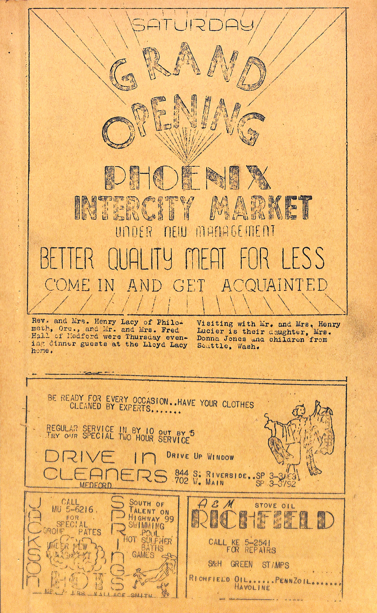AT THE JAN. P.T.A. MEETING the Phoenix PTA will be guests of honor. Mr. James, Supt. of Schools, will speak on consolidation of Jr. High School. There will be a tour of the High School, led by Mr. Thorpe. After the meeting, refreshments will be served. Babysitting available. Everyone attend Thursday, Jan. 21st at 8 pm in the high school. DOG LICENSES MAY NOW BE PURCHASED…at the City Hall. Males, $1.50…Females, $3.00; Spayed females, $1.50. County dog licenses must be purchased before March 1st. PTA EXECUTIVE BOARD MEETING WILL BE HELD Monday after school at the Talent Grade School. UNDERGOES SURGERY Mrs. Dale O'Hara was returned home from the hospital, where she underwent surgery. FEDERATED WOMEN MEET The Talent Federated Women's Club met at the City Hall Tuesday for pot luck and an all-day session. They folded 438 cancer bandages. Mrs. Erby was a guest. MOVING INTO NEW HOME Mr. and Mrs. Lawrence Burnett are moving into their new home on Main and 2nd sts. this week. AROUND TOWN Mr. and Mrs. Chas. Tuggle and son Jack returned home from a three weeks' visit with their families in Missouri on Monday. Mr. and Mrs. Atchison and family have moved to Phoenix. Mr. Atchison is Chief of Police of Phoenix. Mr. and Mrs. Fred Carpenter and daughter, Mary Alice, spent Christmas with Mr. Carpenter's mother in California. Mr. and Mrs. Langley and children of Wagner Creek spent the holidays in Arizona. Mrs. "Bud" Morrow will fly to Los Angeles, where she will spend the weekend visiting her son and daughter and family. Page 2, ads for: THE ABATTOIR MACKAY AUTO CLINIC--Bob Mackay, Jim Engberg JO'S CAFÉ UPTOWN BARBERSHOP Norma Seymour is back at work in the Valley Locker… Mr. and Mrs. Ray Moore and Kevin and Miss Audrey and Cassie Cutburth visited the Fay Moores over the holidays. Mrs. Bill Gleim underwent surgery this week. Mrs. Bob Seymour is over from Klamath Falls to stay with her mother when she returned from the hospital. Page 3, ads for: FARMER'S MKT. CAFÉ MEDFORD BOWLING LANES LITHIA DRIVE-IN FARMER'S INSURANCE--L.H. GALLATIN A&M RICHFIELD LES' BARBERSHOP BOY SCOUTS TO REORGANIZE The Boy Scouts of Troop 110 will be reorganizing soon and will renew their charter. The boys will meet at the Methodist Church Annex. For further information call Howard Lockwood. FOR SALE--House at 112 N. First St. (now rented). For information, write George F. Johnson, P.O. Box 341, Happy Camp, Calif. TALENT LUMBER YARD has moved to the former location of SIS Q FOOD PROD. They will be handling all kinds of building, plumbing and electrical supplies. Will put in a full supply shortly of hardware and other building needs. We will have 2nd hand furniture and goods of all kinds--garden tractors, furniture, chests of drawers, refrigerators, pumps and small tools. We make furniture and cabinets to order.--George Davis and E. G. Rich Page 4, ads for: TALENT THRIFT MARKET FRANK'S 2ND HAND USED FURNITURE--1 mi. sou. Talent on Hiway 99 SEIBER'S BEAUTY SALON Winners of FREE HAIR STYLE are Darlene Flagg and Mrs. O. Otley VALLEY WIDE TV SERVICE THANK YOU NOTE I wish to thank everyone for all the nice gifts I received over the Christmas season. Again, thanks a million to one and all.--M. W. Young, Talent Police Mr. and Mrs. Robert Lilja and family spent the holidays in San Francisco. The Talent Café has reopened after being closed over the holidays. Talent Rural Fire Dept. were called out to a flue fire at the Wayne Reed home Monday. April Burnett spent part of the holidays with her sister, Mrs. Ray Feeler and family, in Klamath Falls. The Wilkins family held a family reunion at the City Hall Christmas Day. The Talent Rural Fire Dept. truck has been undergoing repair and is now back in the Fire Hall and ready for duty. Page 5, ads for: ROSS TV REPAIR DON'S TRACTOR SERVICE SISKIYOU FLOWER SHOP PERL FUNERAL HOME & AMBULANCE SERVICE UNION 76 PRODUCTS--AL GRABHER WANT AD SECTION HUNDREDS OF PEOPLE WILL read your want ad in the NEWS FLASHES. Up to 25 words for 35¢; 70¢ for 25 to 50 words. Phone KE 5-1421; or mail to P.O. Box 405 or bring to 109 S. 2nd St. Publisher, Mae Lowe. ADVERTISE TODAY & GET RESULTS MRS. MARTIN'S HOUSE CLEANING