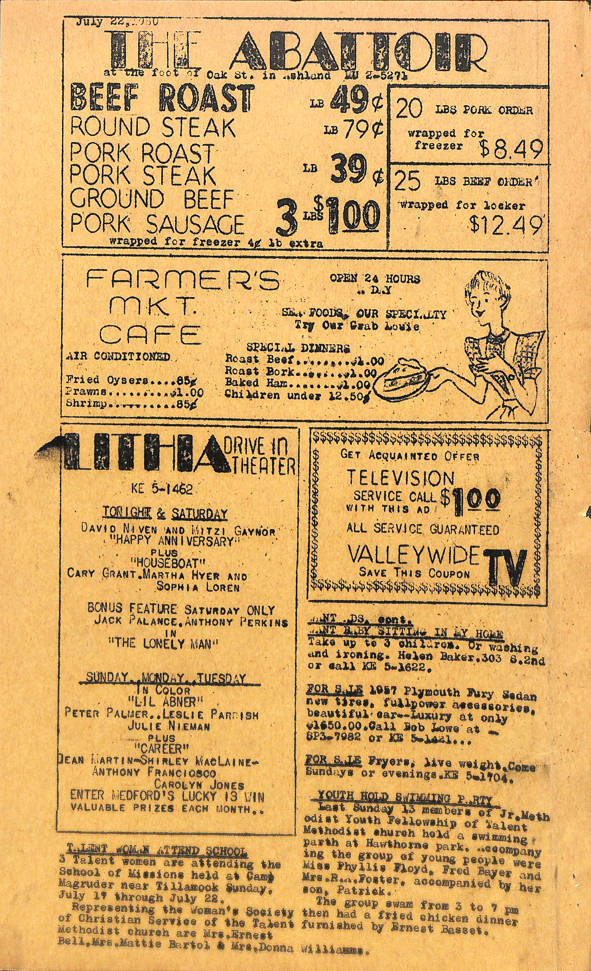 LOOK FOR IT IN OUR YELLOW PAGES. EVERGREEN PRINTING SERVICE ASHLAND SANITARY SERVICE NEWS FLASHES PRINTING SERVICE STEIGER GARAGE WORK HARDWOOD FOR SALE STARK TREES AND SHRUBS FOR RENT--2- & 3-room furnished apts. $25, $30 & $35 per month. Water, garbage paid. Also electricity for lights and refrigerator. KE 5-1276. TALENT LUMBER YARD