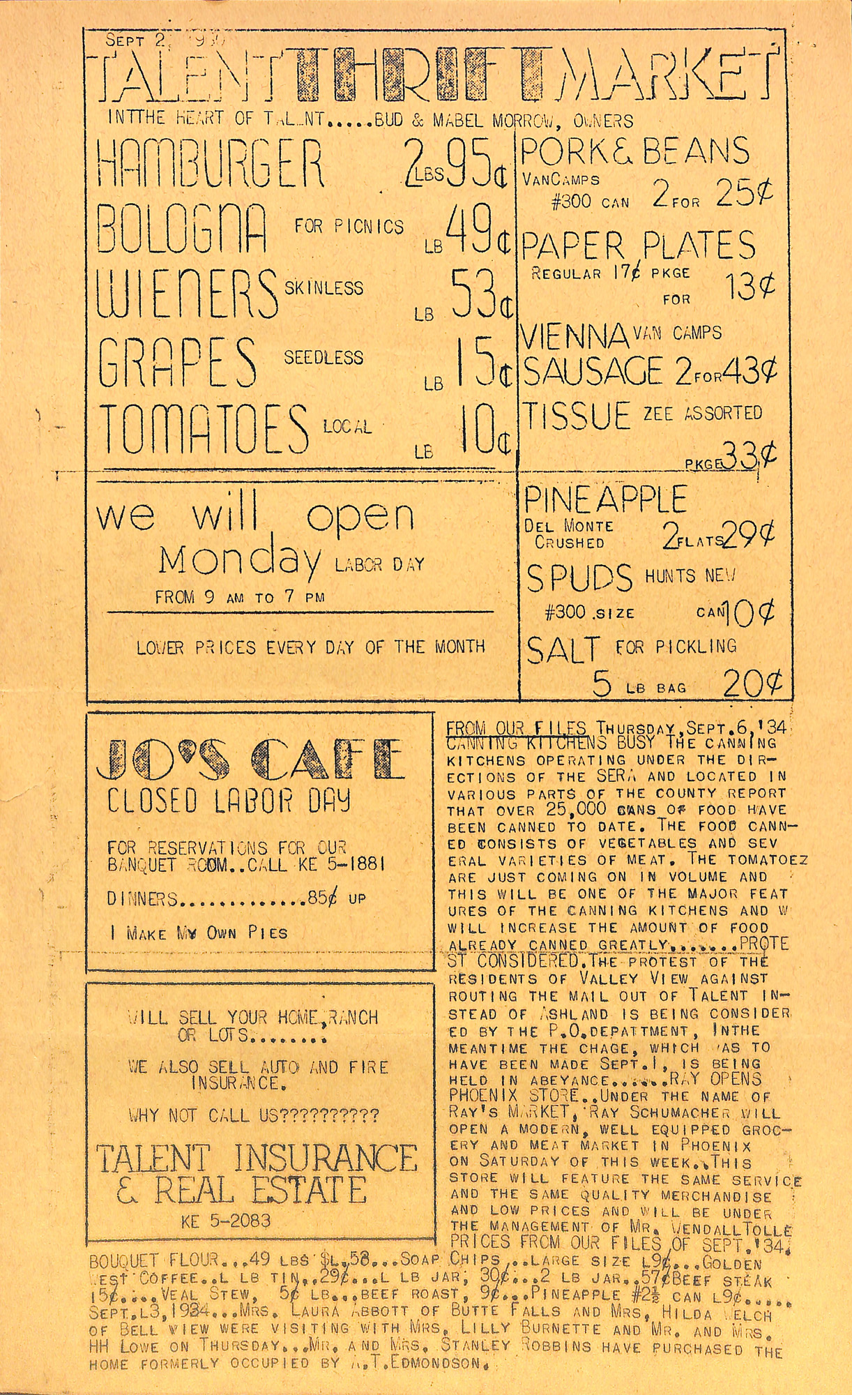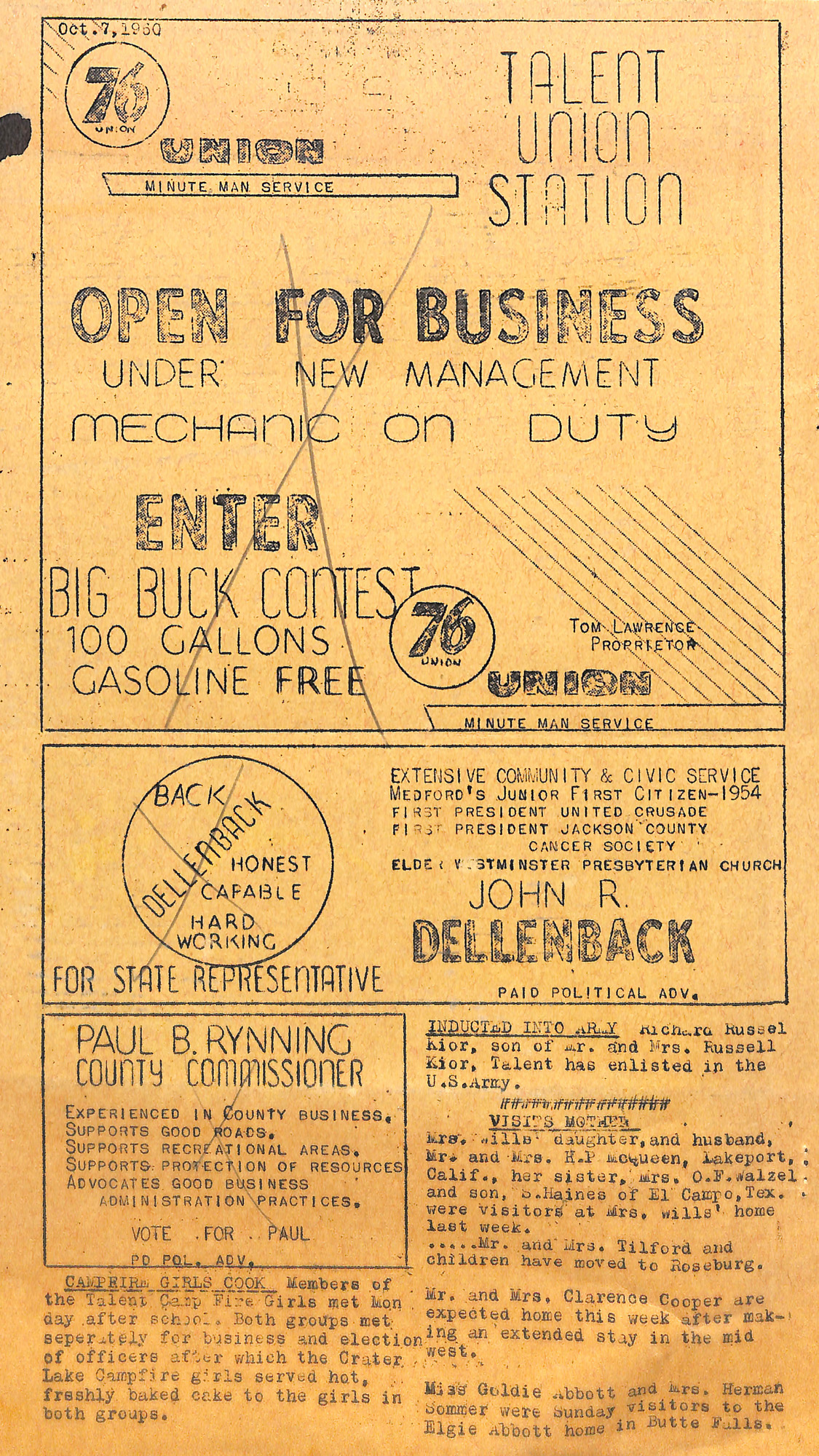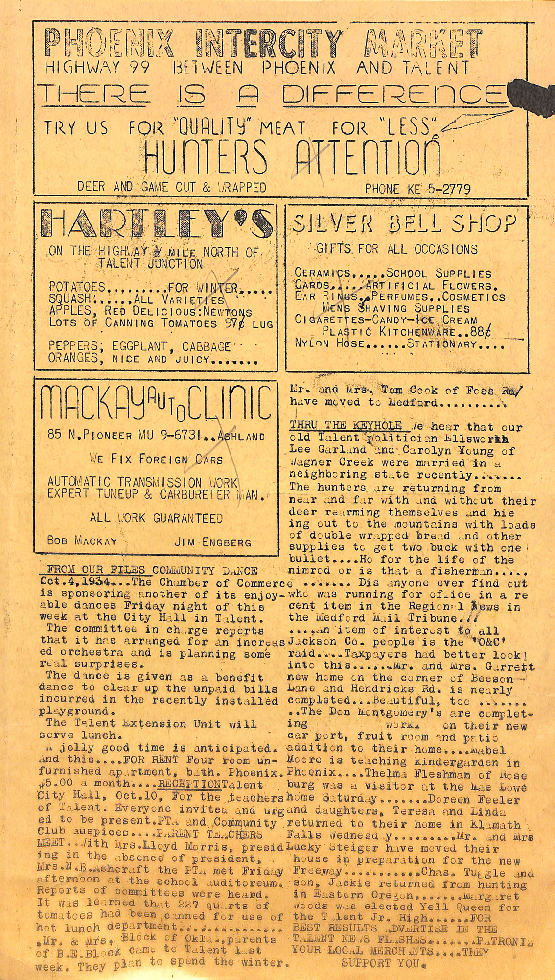 WANT ADS, cont. FOR RENT--modern new house, 2 bedroom, unfurnished. References or will sell. 204 Roy St. KE 5-1281. CAMPFIRE GIRLS The Talent Campfire girls held a very successful food sale Saturday and they wish to thank everyone who helped them. The Campfire girls met Monday after school at the City Hall. They planned part of their ceremonial to be held the evening of Nov. 8 at the City Hall; decided not to have a Hallowe'en party and were served scalloped potatoes which had been prepared by five of the members. OBITUARY--Tamra Lee Wright Funeral services for Tamra Lee Wright, infant daughter of Mr. & Mrs. Jean Wright, 2352 W. McAndrews Rd. were help Friday afternoon at Hillcrest Memorial Park. Tamra Lee was survived by her parents, a brother, grandparents Mrs. Marjorie Head, Eagle Point; Alva Muse, Trail and Mr. and Mrs. Kesse Reeves, Medford. FOR SALE--'51 International pickup good condition. KE 5-1083. Mrs. Wills. Mr. and Mrs. Ray Moore and son returned this week from visiting the Fay Moores in California. Henry Marty, who has been visiting his sister, Mae Lowe, left to visit other relatives in Northern Oregon. He will return later this month to spend some more time at his sister's. Howard Appling, candidate for Secretary of State, was a Thursday visitor at Talent News Flashes. WEDDING BELLS WILL BE RINGING NOV. 18, we hear…. ATTEND DISTRICT WORKSHOP Several members of the Talent Federated Women's Club attended the Institute of Oregon Federation of Women's Clubs of First District at the First Methodist Church in Medford. Mrs. Clay Lee, First Dist. president, presided at the meeting. Oregon Federation of Women's Clubs panel was Mrs. M.M. Nelson, first vice pres. O.F.W.C. and Mrs. John S. Tyler, Jr., Mrs. Fred O. Gast, Mrs. Clark C. McCall, Mrs. Clarence P. McCracken and Mrs. Walter B. Rich. Attending from Talent were Mrs. Ray Burnette, Mrs. Chas. Tuggle, Mrs. E.E. Culver, Mrs. Jessie Niswanger, Mrs. George Brent, and Mrs. Finley. The afternoon session was taken up with Jr. Club and district affairs. Pages for the day were Mrs. Willis T. Fasel and Mrs. Chas. Tuggle. TO HAVE COFFEE HOUR Talent grade school room mothers and teachers will have a coffee hour Oct. 24 at the school cafeteria. Room mothers and teachers of grades 1 through 3 will meet at 2:30 pm. Grades 4 through 6 will meet at 3:50 pm. The meetings are planning sessions for organization of parties throughout the year. Page 5, full-page ad for: DRIVE-IN MARKET Page 6, ads for: DRIVE-IN CLEANERS ARLIE'S TV REPAIR FARMER'S INSURANCE--L.H. GALLATIN UPTOWN BARBERSHOP ELECT GERALD "JERRY" SCANNELL--DISTRICT ATTORNEY AL GRABHER'S MOBILE FEED SERVICE VALLEYWIDE TV John Barger brought back a really big buck…7 points on one side & 8 on the other. He has entered it in the big buck contest. FROM OUR FILES--Oct. 25, 1934 Talent Eats Waffles…Last night the Talent PTA staged their annual waffle supper at the City Hall. Judging by the crowd, everybody in the community attended. Waffles and more waffles served with sausages and syrup. Coffee and pie and plenty of rich cream. The ladies advertised all you can eat for 10¢ and the guests sure got it. A musical program was given during and immediately following the supper. A nice sum was added to the hot lunch fund of the school and the affair was in every way a success. DICKEY TRYOR WEDDING Wednesday at two o'clock Mr. John Dickey and Mrs. Laura Tryor were married at the home of Mr. and Mrs. Elmer Kincaid. The ring ceremony was performed by Rev. E. Deacon. Miss Pearl Russell carried the ring and Mr. J. Brant acted as best man. School census is being taken this week by Mrs. Parthena Terrill, school clerk TALENT HEALTH UNIT met at the home of Mrs. Ed. Robison. Mr. and Mrs. Ted DeFord have a new baby girl. Page 7, ads for: ELECT EDWIN R. DURNO--U.S. CONGRESSMAN--Republican 4th District JOHN R. DELLENBACK FOR STATE REPRESENTATIVE RE-ELECT RAY J. SCHUMACHER COUNTY ASSESSOR PAUL B. RYNNING--COUNTY COMMISSIONER RE-ELECT EVE NYE--STATE REPRESENTATIVE PROMOTED Airman First Class David A. Denison, son of Mr. and Mrs. A.W. Graham, Rt. 1, Box 421, Talent, was promoted to that rank recently at James Connally Air Force Base, Tex., where he is an aircraft mechanic in the 3567th Flight Line Maintenance Squadron. Denison graduated from Ashland High School in 1957. ENTERS NAVY Patrick Harris, son of Mr. and Mrs. H.B. Harris, Anderson Cr. Rd., Talent, entered the U.S. Navy last Thursday. He will be stationed at San Diego, Calif. for his basic training. He graduated from Talent High School in 1959. ENTERS MARINES Thomas Burnette, son of Mr. and Mrs. Ray Burnette, Rt. 1, Box 388, Talent, left Sunday morning for service with the U.S. Marines. He will undergo basic training at San Diego, Calif. He is a 1959 graduate of Talent High School. Page 8, ads for: ROSS TV & RADIO SERVICE DON'S FARMING SERVICE PERL FUNERAL HOME & AMBULANCE SERVICE BEN'S OK NEW & 2ND HAND STORE LES' BARBERSHOP WANT AD SECTION Hundreds of families will read your ad in the TALENT NEWS FLASHES. Up to 25 words for 35¢; 25 to 50 words, 70¢. Phone KE 5-1421 or mail to P.O. Box 405 or bring to 109 S. 2nd St., Talent, Oregon. DEADLINE FOR WANT ADS WEDNESDAY