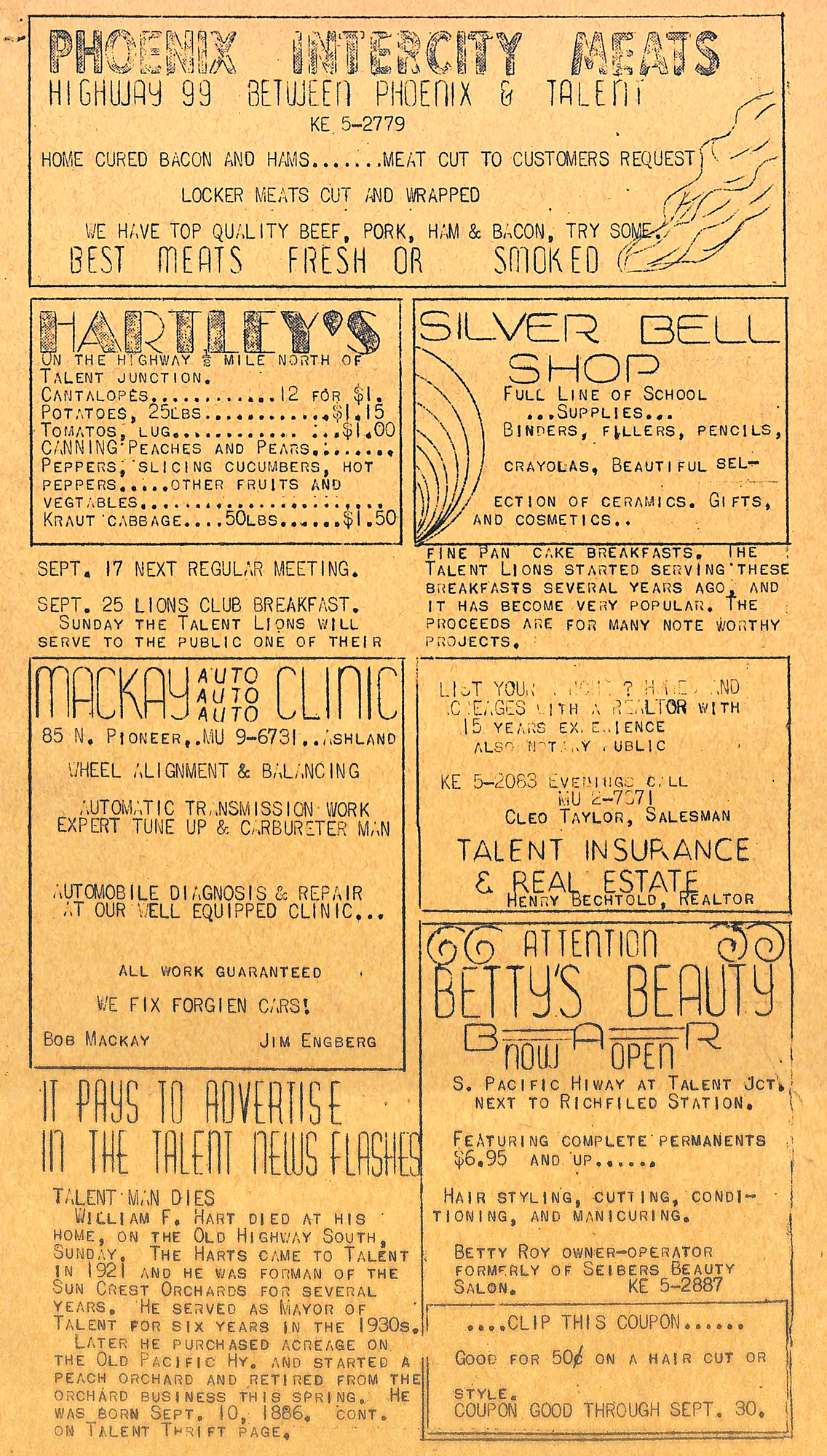 RECEIVES PLAQUE Mrs. Frank Christian received a beautiful plaque from the State Blind Board for the work the state Lions Aux. have done for blind children and their parents. Mrs. Christian inaugurated the district workshop for parents of blind children which was very effective. Page 6, ads for: ROSS TV & RADIO SERVICE DON'S FARMING SERVICE PERL FUNERAL HOME & AMBULANCE SERVICE BEN'S OK NEW & 2ND HAND STORE LES' BARBERSHOP WANT AD SECTION Hundreds of families will read your ad in the TALENT NEWS FLASHES. Up to 25 words for 35¢; 25 to 50 words, 70¢. Phone KE 5-1421, or mail to P.O. Box 405, or bring to 109 S. 2nd St., Talent, Oregon. DEADLINE FOR WANT ADS WEDNESDAY