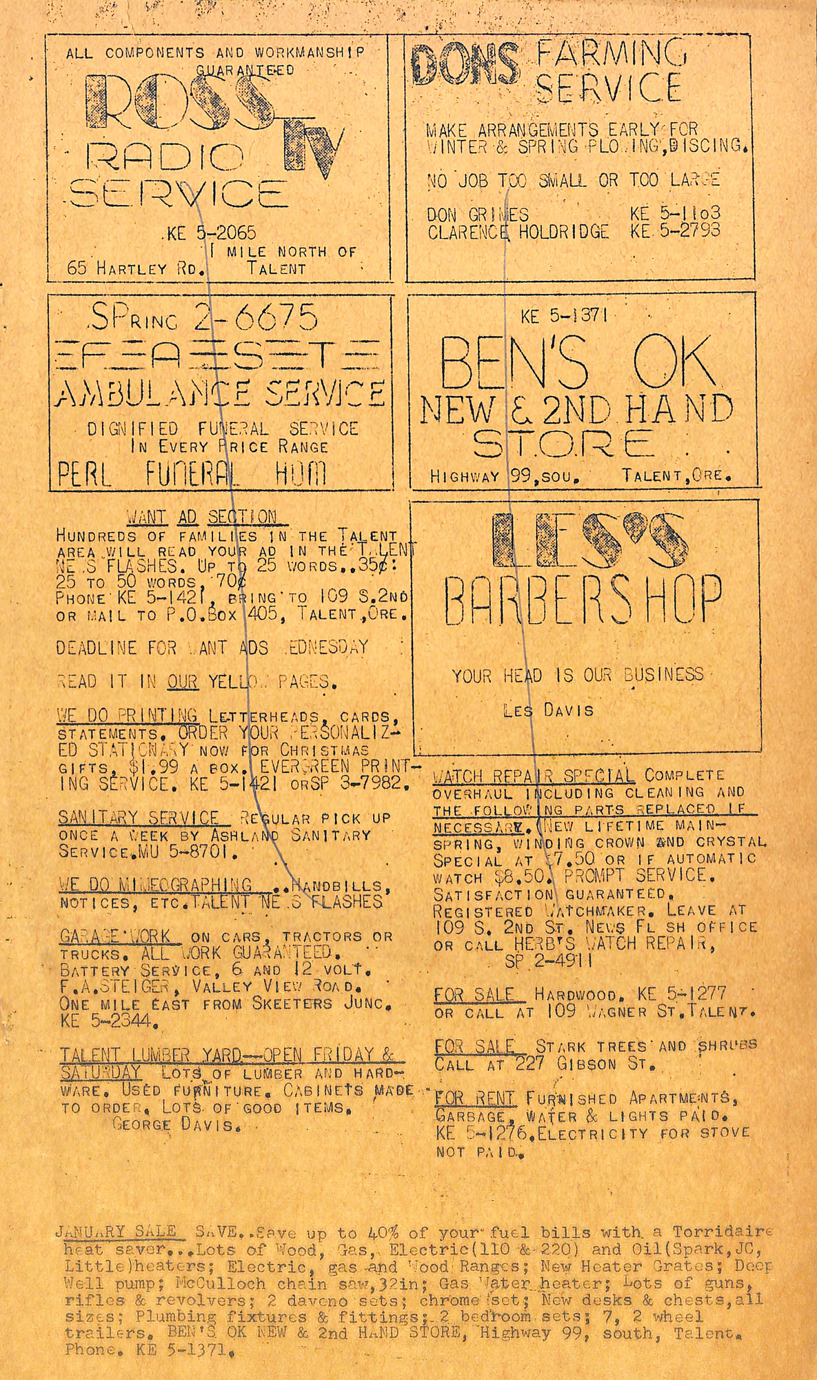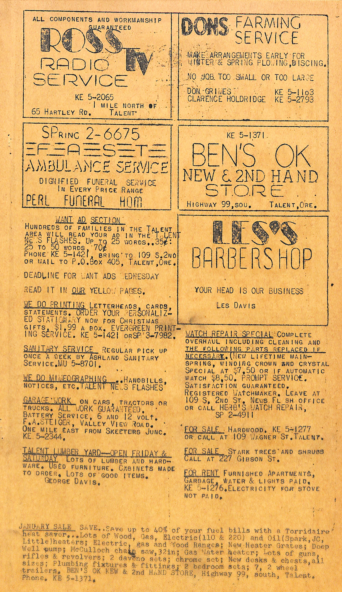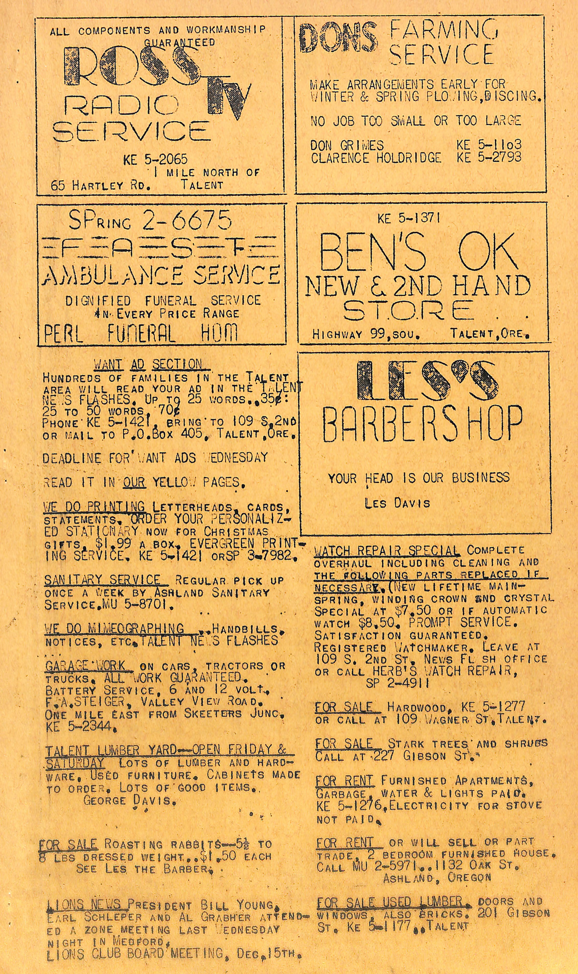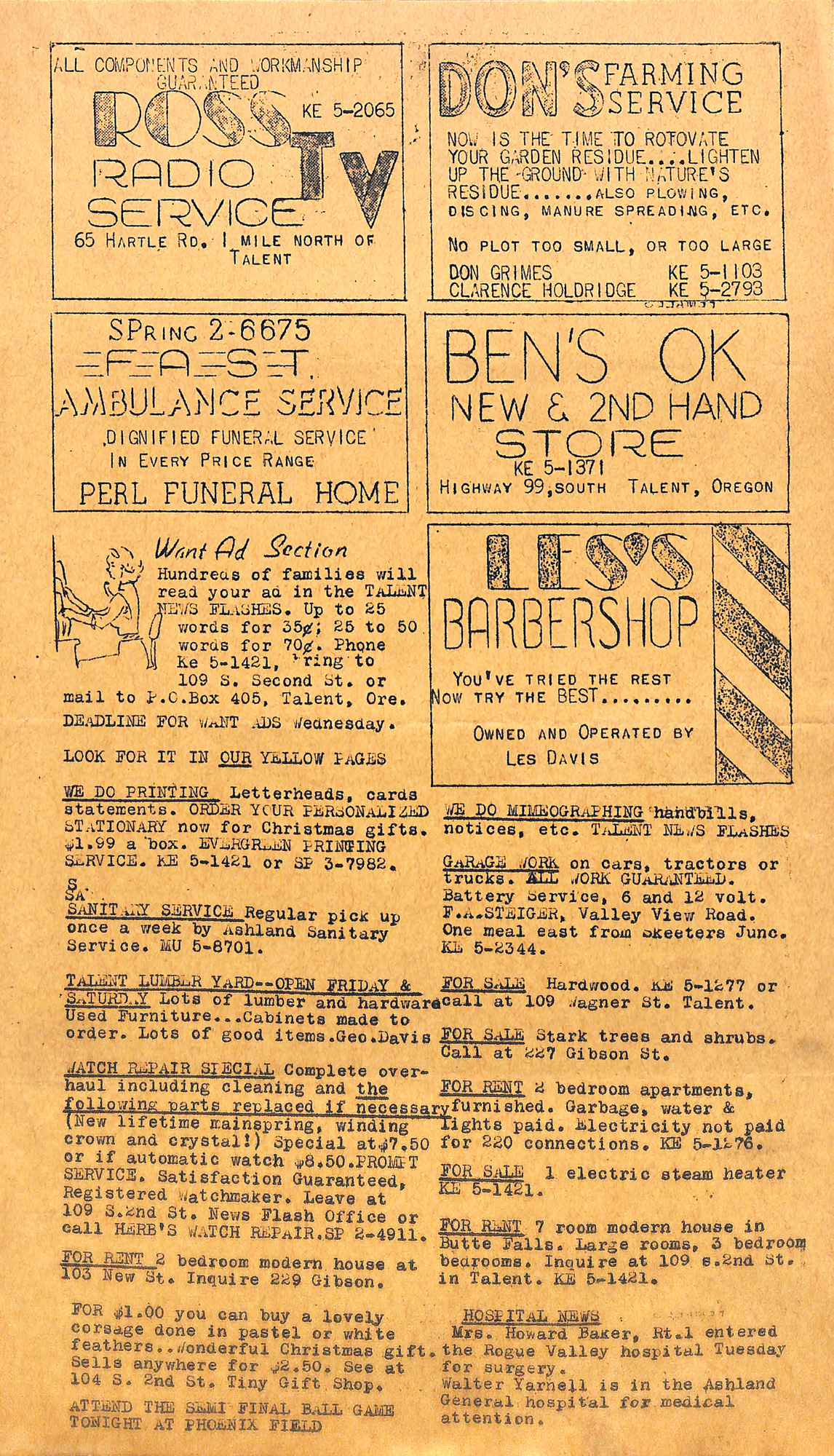 BORN--to Mr. and Mrs. Bob Jacobs, a girl, 6 lbs., 8 oz. December 8, at Rogue Valley Hospital. The proud parents have named her Jacqueline Kay. The grandparents are Mr. & Mrs. P.J. McAbee and Mr. & Mrs. Leo Jacobs. The happy grandparents have survived the event in reasonably good shape. Congratulations to all! BEN'S O.K--one mile north of Jackson Hot Springs Give a subscription to Talent News Flashes for Christmas…you pay the postage…we'll do the rest. Mailed everywhere for cost of postage. Phone KE 5-1421. No other newspaper can make that statement. Page 3, ads for: ROSS TV & RADIO SERVICE DON'S FARMING SERVICE PERL FUNERAL HOME & AMBULANCE SERVICE BEN'S OK NEW & 2ND HAND STORE LES' BARBERSHOP WANT AD SECTION Hundreds of families in the Talent area will read your ad in the TALENT NEWS FLASHES. Up to 25 words…35¢; 25 to 50 words, 70¢. Phone KE 5-1421, bring to 109 S. 2nd or mail to P.O. Box 405, Talent, Ore. DEADLINE FOR WANT ADS WEDNESDAY