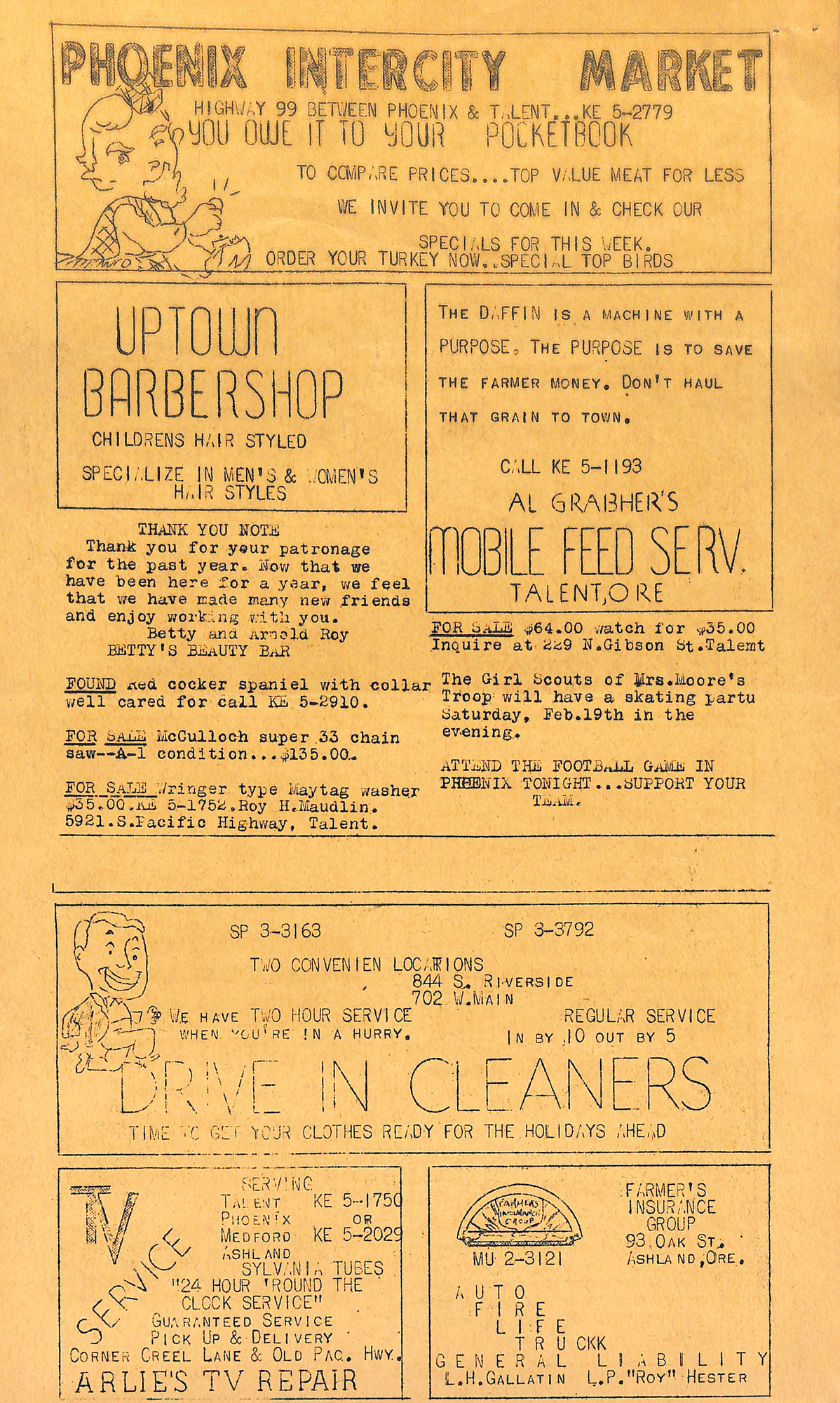 Page 3, ads for: DRIVE-IN CLEANERS ARLIE'S TV REPAIR SERVICE FARMER'S INSURANCE--L.H. GALLATIN UPTOWN BARBERSHOP AL GRABHER'S MOBILE FEED STORE PHOENIX INTERCITY MEATS FOR SALE--$15.00 Wards' largest spring mounted hobby horse. New $31.95. For Sale--$15.00 size 12 maternity wardrobe. KE 5-1015. After 5 pm. FOR SALE--1954 Volkswagen sedan, good condition, $600.00 cash. KE 5-2828, 106 New St. FOR RENT OR LEASE--Two-bedroom house after the first. Inquire Les' Barbershop. LOST--Handmade miniature purse, zipper top, contained $1.25. MU 2-0652, 308 E. Main, Ashland. Lost in Talent. CARRIAGE TRADE Word has been received of the birth of a daughter, Lisa Sue, Dec. 12, to Mr. and Mrs. Monty Montgomery, Bend, Ore. Pink McAbee was seen with a look of indecision and his head stuck out the window of his pickup the other day. OPENS CUT RATE GAS STATION Tom Lawrence, who has been operating the Union 76, has changed it to the CUT RATE GAS STATION. He will handle anything and everything as well as low-priced gas. Mr. Lawrence is a nice young man, so why not drop in and get acquainted. THANKS We wish to thank the many people who purchased Christmas trees from us. Park