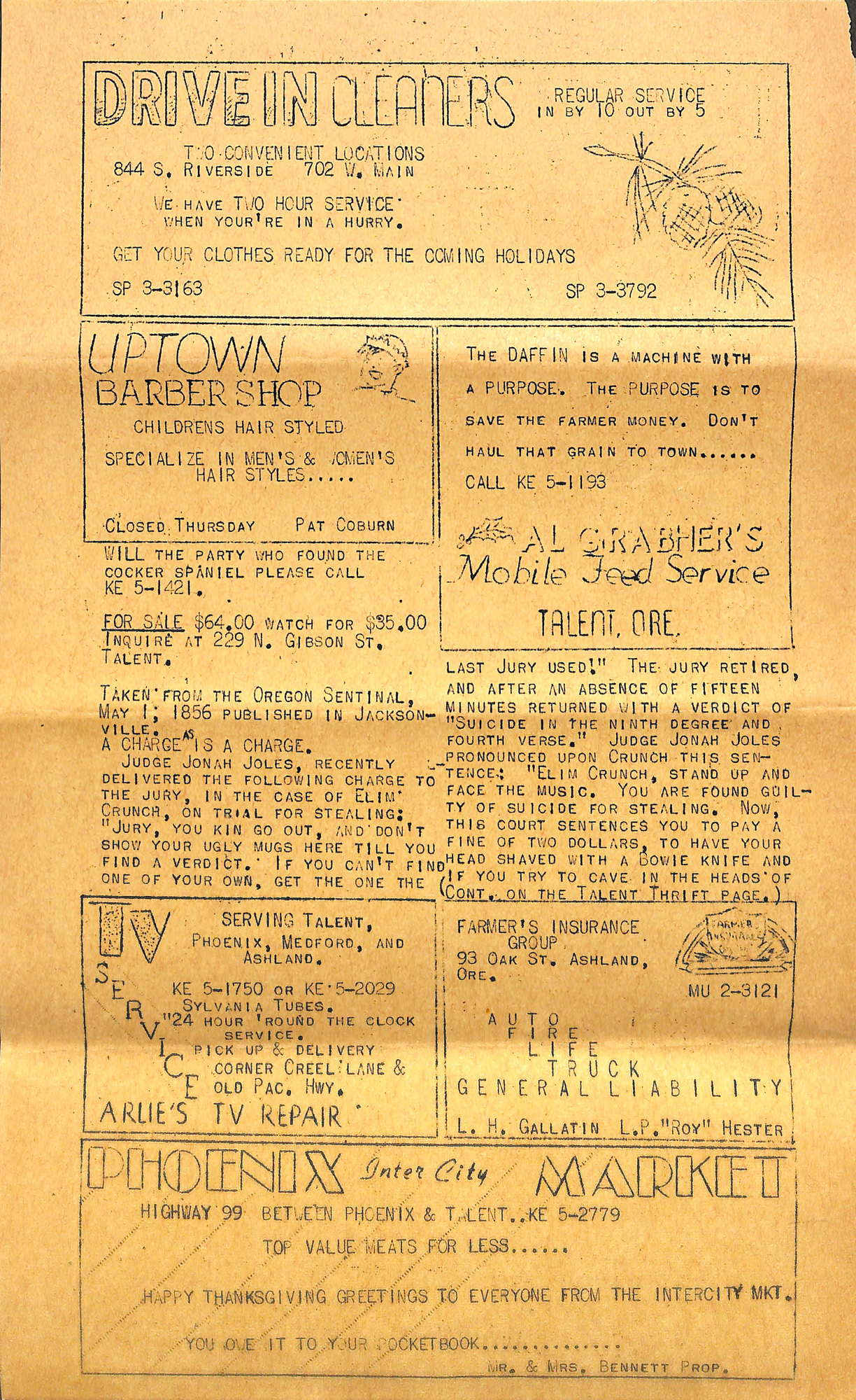 STEIGER GARAGE WORK HARDWOOD FOR SALE STARK TREES AND SHRUBS FOR RENT--2-bedroom apartments, furnished. Garbage, water & lights paid. Electricity not paid for 220 connections. KE 5-1276. FOR SALE--1 electric steam heater. KE 5-1421. Page 4, full-page ad for: VALLEY LOCKER & GROCERY Page 5, ads for: DRIVE-IN CLEANERS UPTOWN BARBERSHOP AL GRABHER'S MOBILE FEED SERVICE ARLIE'S TV REPAIR SERVICE FARMER'S INSURANCE--L.H. GALLATIN PHOENIX INTERCITY MARKET WILL the party who found the cocker spaniel please call KE 5-1421. FOR SALE--$64.00 watch for $35.00. Inquire at 229 N. Gibson St., Talent. Taken from the Oregon Sentinel, May 1, 1856, published in Jacksonville. A CHARGE AS IS A CHARGE. Judge Jonah Joles recently delivered the following charge to the jury in the case of Elim Crunch, on trial for stealing: "Jury, you kin go out, and don't show your ugly mugs here till you find a verdict. If you can't find one of your own, get the one the last jury used!" The jury retired and after an absence of fifteen minutes returned with a verdict of "Suicide in the ninth degree and fourth verse." Judge Jonah Joles pronounced upon Crunch this sentence: "Elim Crunch, stand up and face the music. You are found guilty of suicide for stealing. Now this court sentences you to pay a fine of two dollars, to have your head shaved with a bayonet and if you try to cave in the heads of (Cont. on the Talent Thrift page.) HELP yourself to relaxation as in the good old days! Simple to mix recipes for Grandma's soothing, relaxing, expensive herb bath, passed down secretly through three generations. Send $1.00 and self-addressed envelope to Whispering Pines Love Haven, P.O. Box 165, Ashland, Ore. A CHARGE AS IS A CHARGE, cont. any of the jury, you'll catch thunder. That's all. Your fate will be a warning to others; and may the Lord have mercy on your soul! Sheriff, git me a pint of red-eye. I'm awful thirsty." FOR SALE--Good Montag wood heater, $25.00. KE 5-2326. Route 1, box 56 on the old highway. On Nov. 22, 1906, the first Radio Distress Signal (S.O.S.) was adopted. THE FIRST THANKSGIVING was held on Nov. 25, 1668. DONATE your discarded toys to the Camp Fire girls. Page 7, full-page ad for: DRIVE-IN MARKET --------------------------------------------------- Talent News Flashes NEWS FLASHES ARE DELIVERED TO YOU THROUGH THE COURTESY OF YOUR ADVERTISERS…PATRONIZE THEM Printed Weekly Since 1934 Everybody Reads the Talent News Flashes Published in Talent, Site of Old Ft. Wagner LAST SPIKE DRIVEN IN SOUTHERN PACIFIC DEC. 2, 1887 Dec. 2, 1960 Volume XXIV Publisher and Editor, Mae Lowe, 109 South 2nd St. Talent, Oregon KE 5-1421 20 Shopping Days till Christmas