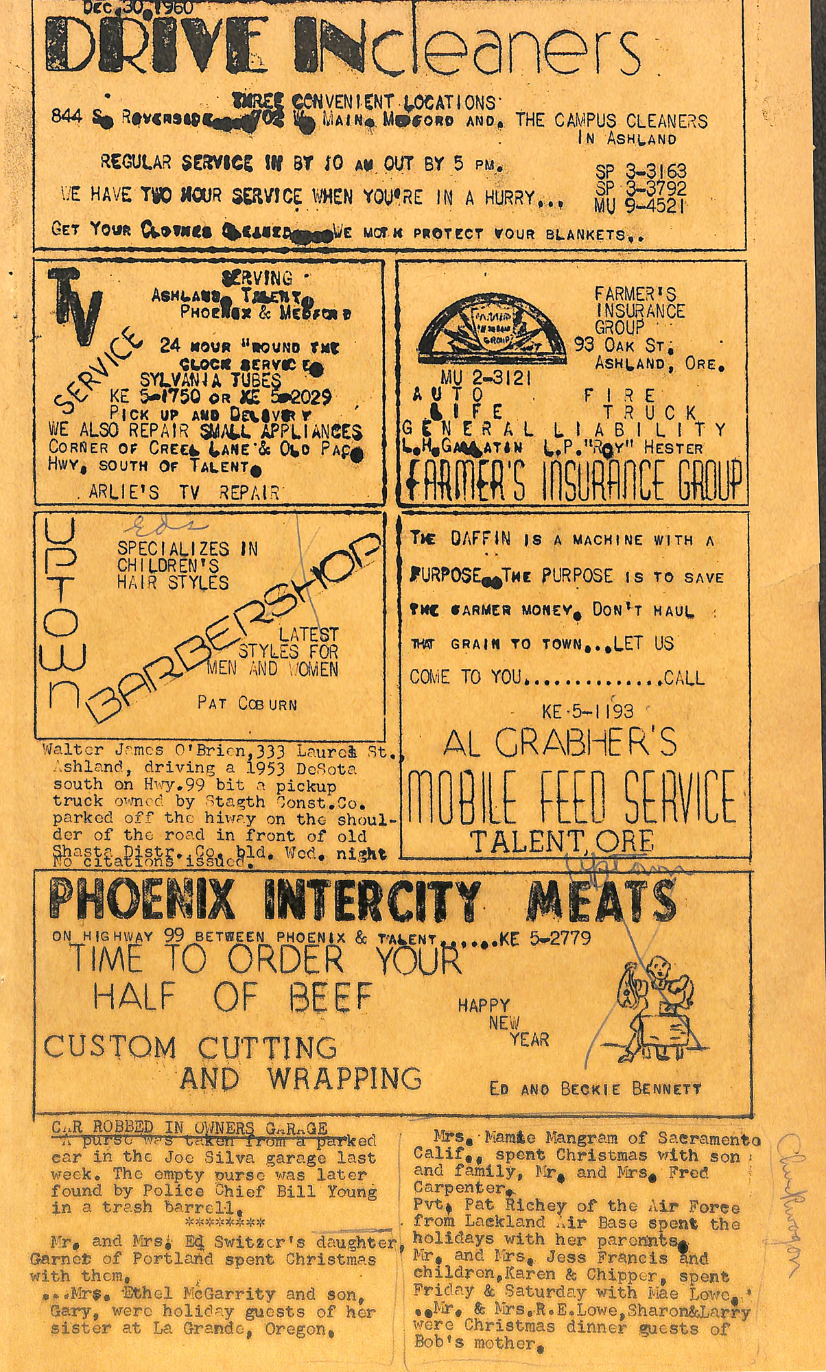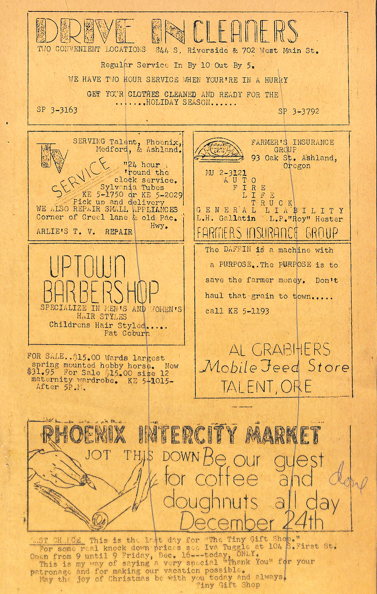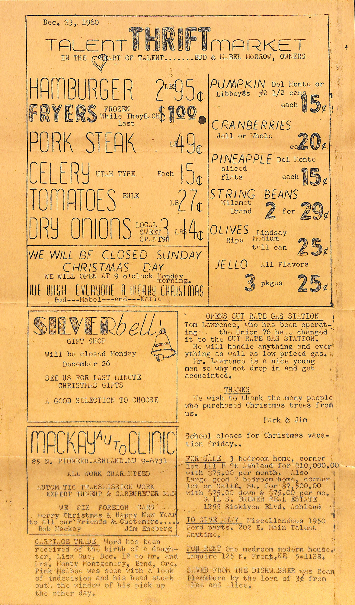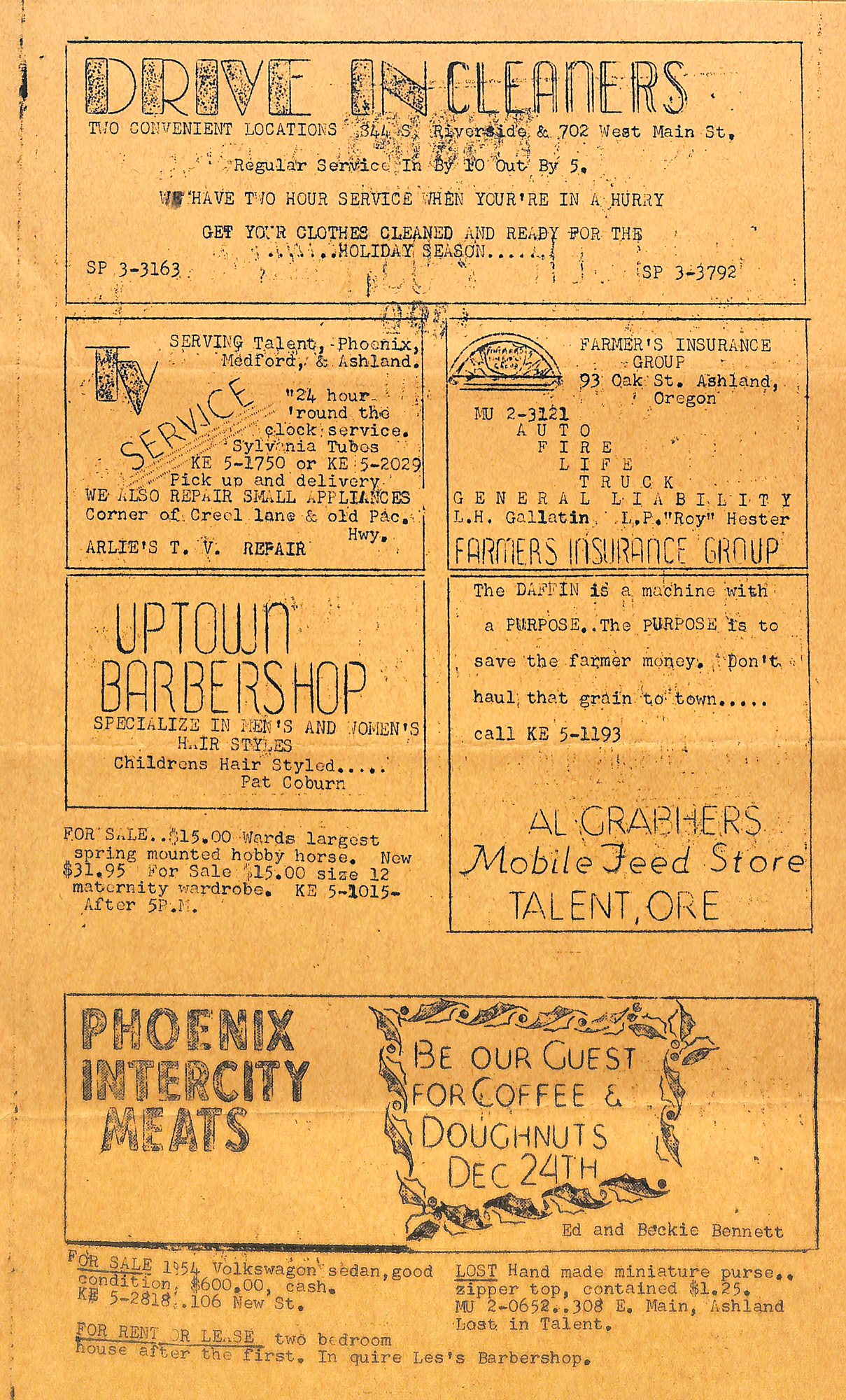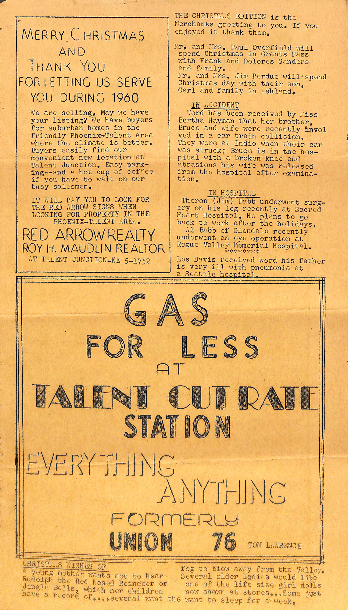School closes for Christmas vacation Friday… FOR SALE--3-bedroom home, corner lot, 111 B St., Ashland, for $10,000.00 with $75.00 per month. Also large good 2-bedroom home, corner lot on Calif. St. for $7,500.00 with $75.00 down & $75.00 per mo.--GAIL S. BREWER REAL ESTATE, 1255 Siskiyou Blvd., Ashland TO GIVE AWAY--Miscellaneous 1950 Ford parts. 202 E. Main, Talent. Anytime. FOR RENT--One-bedroom modern house. Inquire 125 N. Front. KE 5-1128. SAVED FROM THE DISHWASHER was Dean Blackburn by the loan of 3¢ from Mae and Alice. Christmas Greeting Page 5, ads for: RED ARROW REALTY--Merry Christmas and thank you for letting us serve you during 1960. GAS FOR LESS--Formerly Union 76--Tom Lawrence CHRISTMAS WISHES OF A young mother wants not to hear Rudolph the Red Nosed Reindeer or Jingle Bells, which her children have a record of…several want the fog to blow away from the Valley. Several older ladies would like one of the life-size girl dolls now shown at stores…Some just want to sleep for a week. THIS CHRISTMAS EDITION is the merchants' greeting to you. If you enjoyed it, thank them. Mr. and Mrs. Paul Overfield will spend Christmas in Grants Pass with Frank and Dolores Sanders and family. Mr. and Mrs. Jim Perdue will spend Christmas Day with their son, Carl and family, in Ashland. IN ACCIDENT Word has been received by Miss Bertha Hayman that her brother Bruce and wife were recently involved in a car-train collision. They were at Indio when their car was struck. Bruce is in the hospital with a broken knee and abrasions; his wife was released from the hospital after examination. IN HOSPITAL Theron (Jim) Babb underwent surgery on his leg recently at Sacred Heart Hospital. He plans to go back to work after the holidays. Al Babb of Glendale recently underwent an eye operation at Rogue Valley Memorial Hospital. Les Davis received word his father is very ill with pneumonia at a Seattle hospital. Page 6, full-page ad for: DRIVE-IN MARKET Page 7, ads for: ROSS TV & RADIO SERVICE DON'S FARMING SERVICE PERL FUNERAL HOME & AMBULANCE SERVICE BEN'S NEW & 2ND HAND STORE LES' BARBERSHOP WANT AD SECTION Hundreds of families in the Talent area will read your ad in the TALENT NEWS FLASHES. Up to 25 words…35¢; 25 to 50 words, 70¢. Phone KE 5-1421, bring to 109 S. 2nd or mail to P.O. Box 405, Talent, Ore. DEADLINE FOR WANT ADS WEDNESDAY