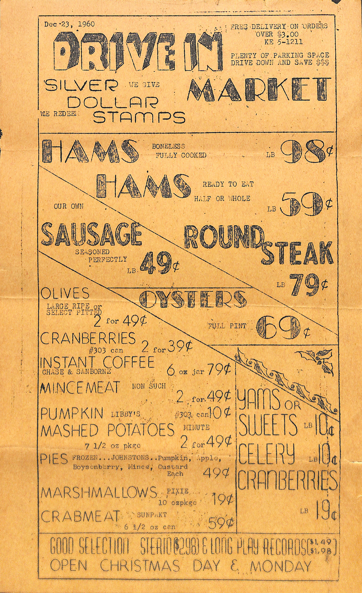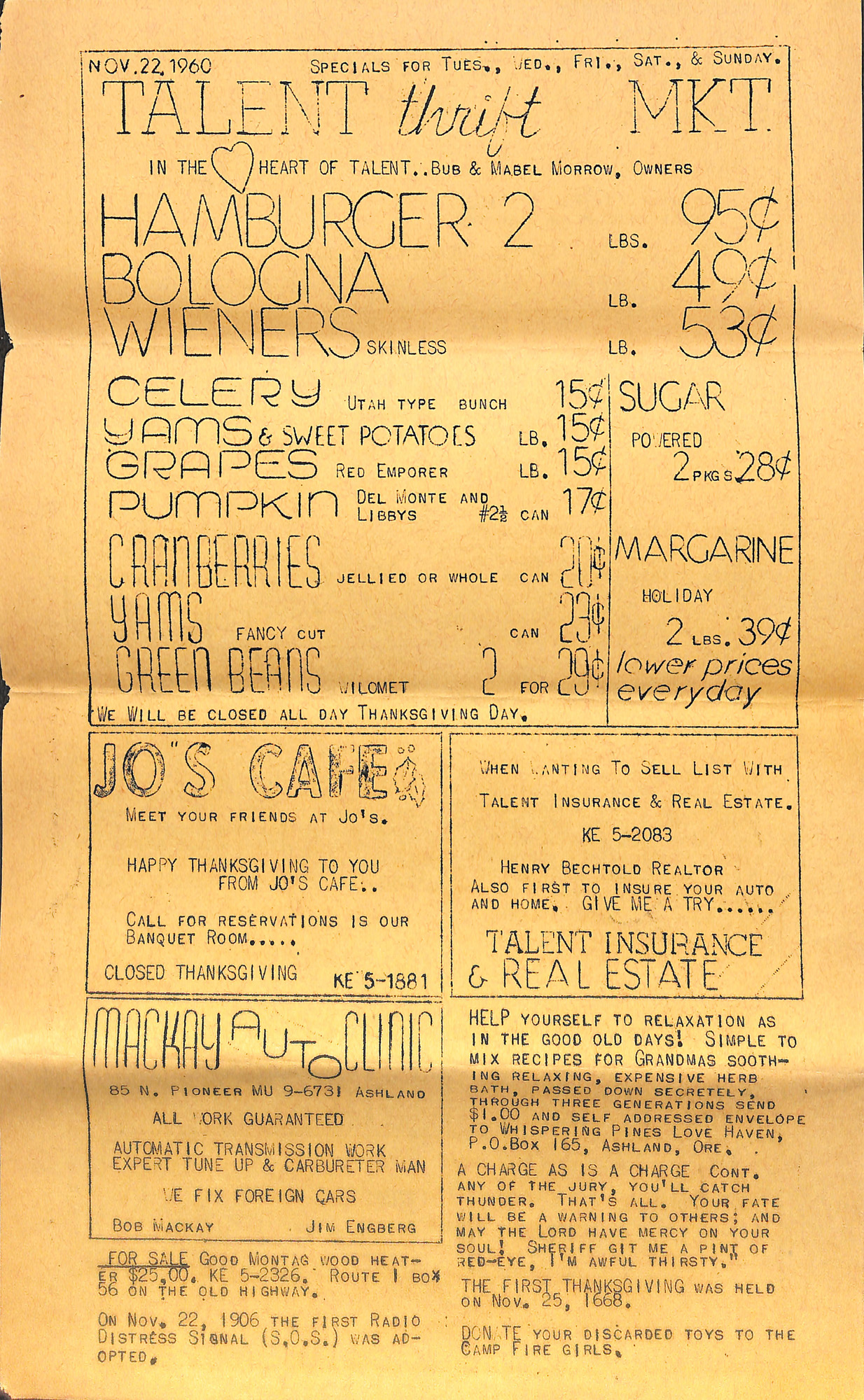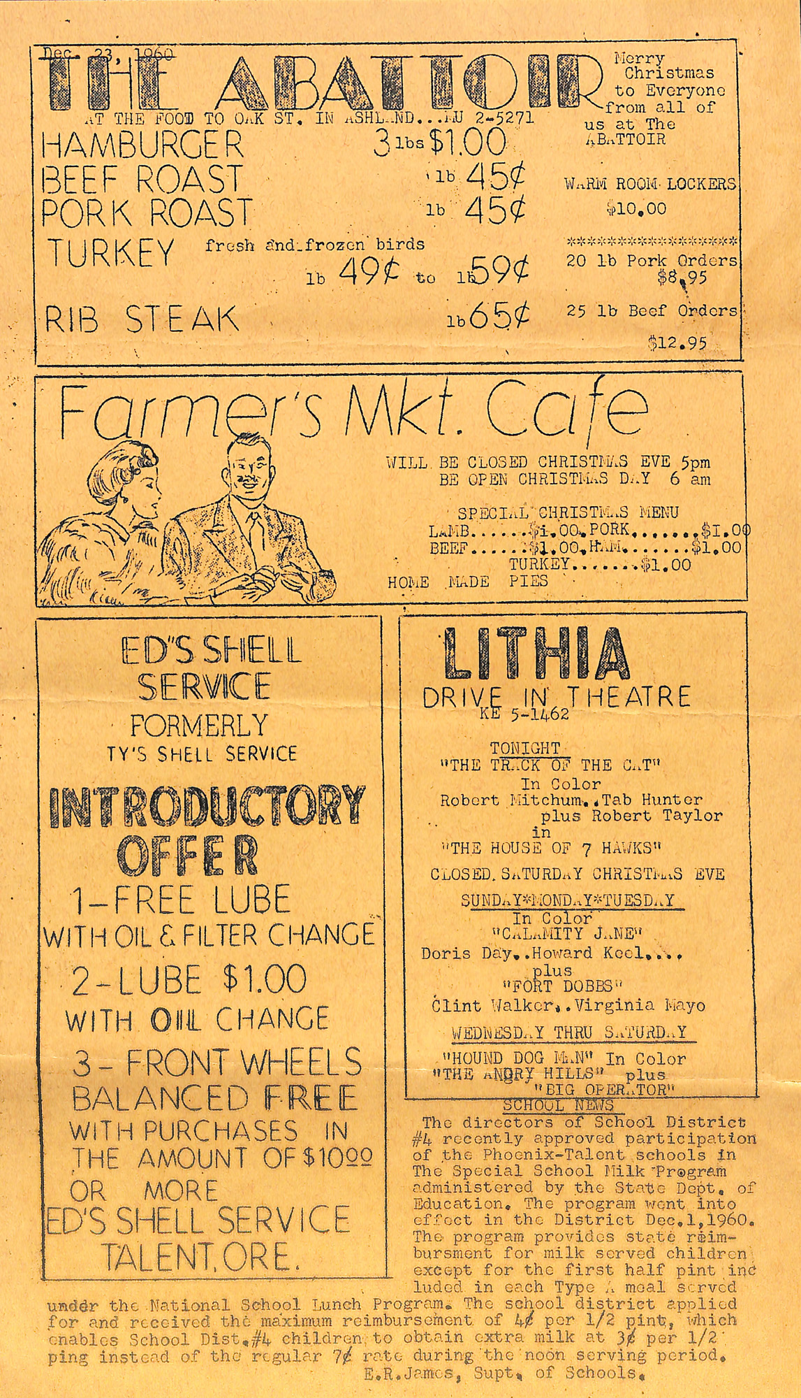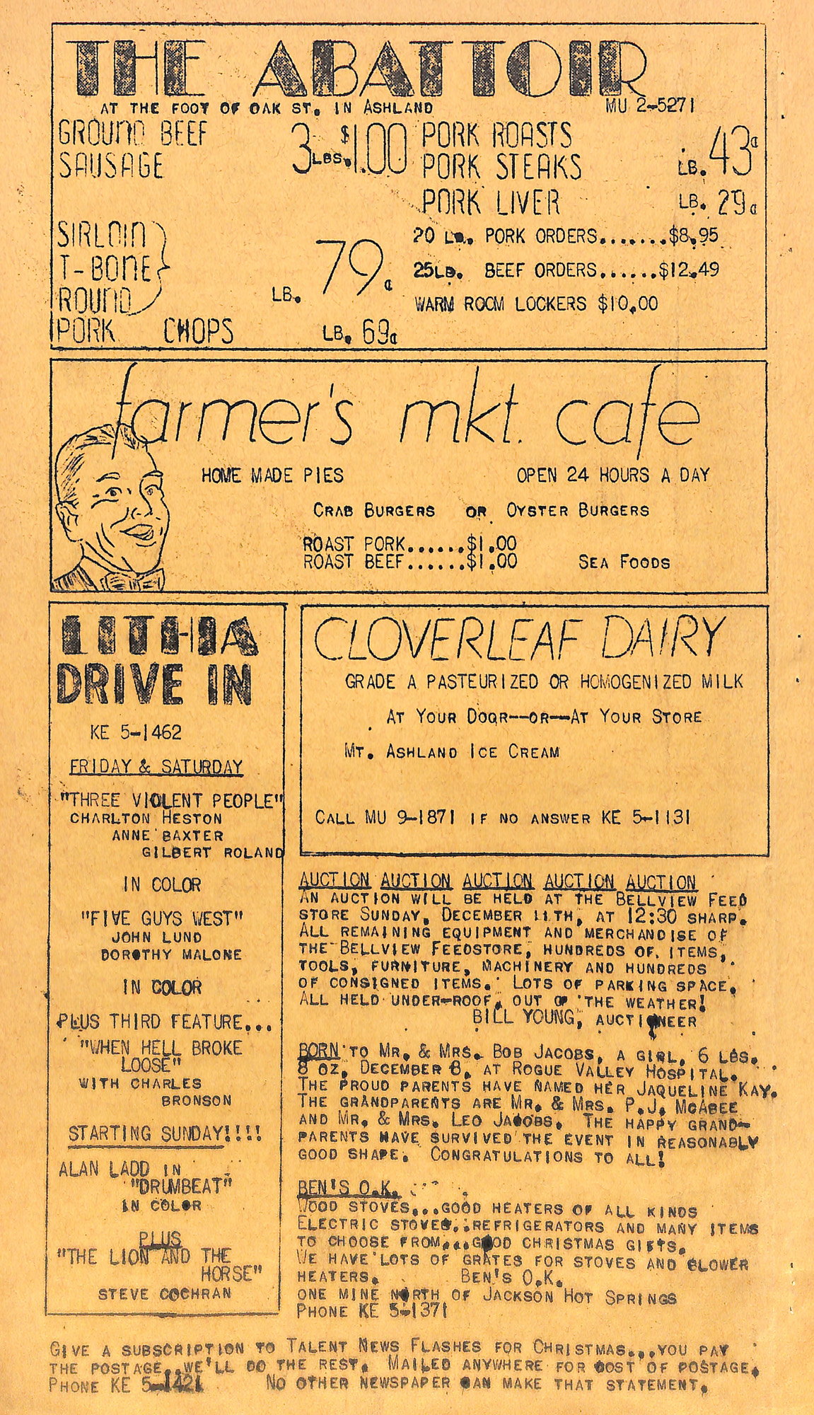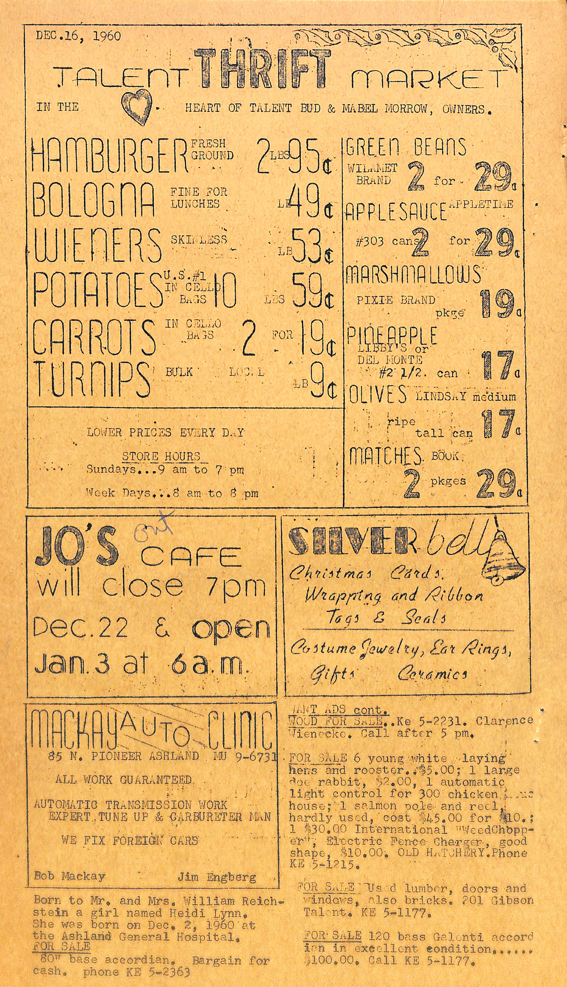 School closes for Christmas vacation Friday… FOR SALE--3-bedroom home, corner lot, 111 B St., Ashland, for $10,000.00 with $75.00 per month. Also large good 2-bedroom home, corner lot on Calif. St. for $7,500.00 with $75.00 down & $75.00 per mo.--GAIL S. BREWER REAL ESTATE, 1255 Siskiyou Blvd., Ashland TO GIVE AWAY--Miscellaneous 1950 Ford parts. 202 E. Main, Talent. Anytime. FOR RENT--One-bedroom modern house. Inquire 125 N. Front. KE 5-1128. SAVED FROM THE DISHWASHER was Dean Blackburn by the loan of 3¢ from Mae and Alice. Christmas Greeting Page 5, ads for: RED ARROW REALTY--Merry Christmas and thank you for letting us serve you during 1960. GAS FOR LESS--Formerly Union 76--Tom Lawrence CHRISTMAS WISHES OF A young mother wants not to hear Rudolph the Red Nosed Reindeer or Jingle Bells, which her children have a record of…several want the fog to blow away from the Valley. Several older ladies would like one of the life-size girl dolls now shown at stores…Some just want to sleep for a week. THIS CHRISTMAS EDITION is the merchants' greeting to you. If you enjoyed it, thank them. Mr. and Mrs. Paul Overfield will spend Christmas in Grants Pass with Frank and Dolores Sanders and family. Mr. and Mrs. Jim Perdue will spend Christmas Day with their son, Carl and family, in Ashland. IN ACCIDENT Word has been received by Miss Bertha Hayman that her brother Bruce and wife were recently involved in a car-train collision. They were at Indio when their car was struck. Bruce is in the hospital with a broken knee and abrasions; his wife was released from the hospital after examination. IN HOSPITAL Theron (Jim) Babb underwent surgery on his leg recently at Sacred Heart Hospital. He plans to go back to work after the holidays. Al Babb of Glendale recently underwent an eye operation at Rogue Valley Memorial Hospital. Les Davis received word his father is very ill with pneumonia at a Seattle hospital. Page 6, full-page ad for: DRIVE-IN MARKET Page 7, ads for: ROSS TV & RADIO SERVICE DON'S FARMING SERVICE PERL FUNERAL HOME & AMBULANCE SERVICE BEN'S NEW & 2ND HAND STORE LES' BARBERSHOP WANT AD SECTION Hundreds of families in the Talent area will read your ad in the TALENT NEWS FLASHES. Up to 25 words…35¢; 25 to 50 words, 70¢. Phone KE 5-1421, bring to 109 S. 2nd or mail to P.O. Box 405, Talent, Ore. DEADLINE FOR WANT ADS WEDNESDAY