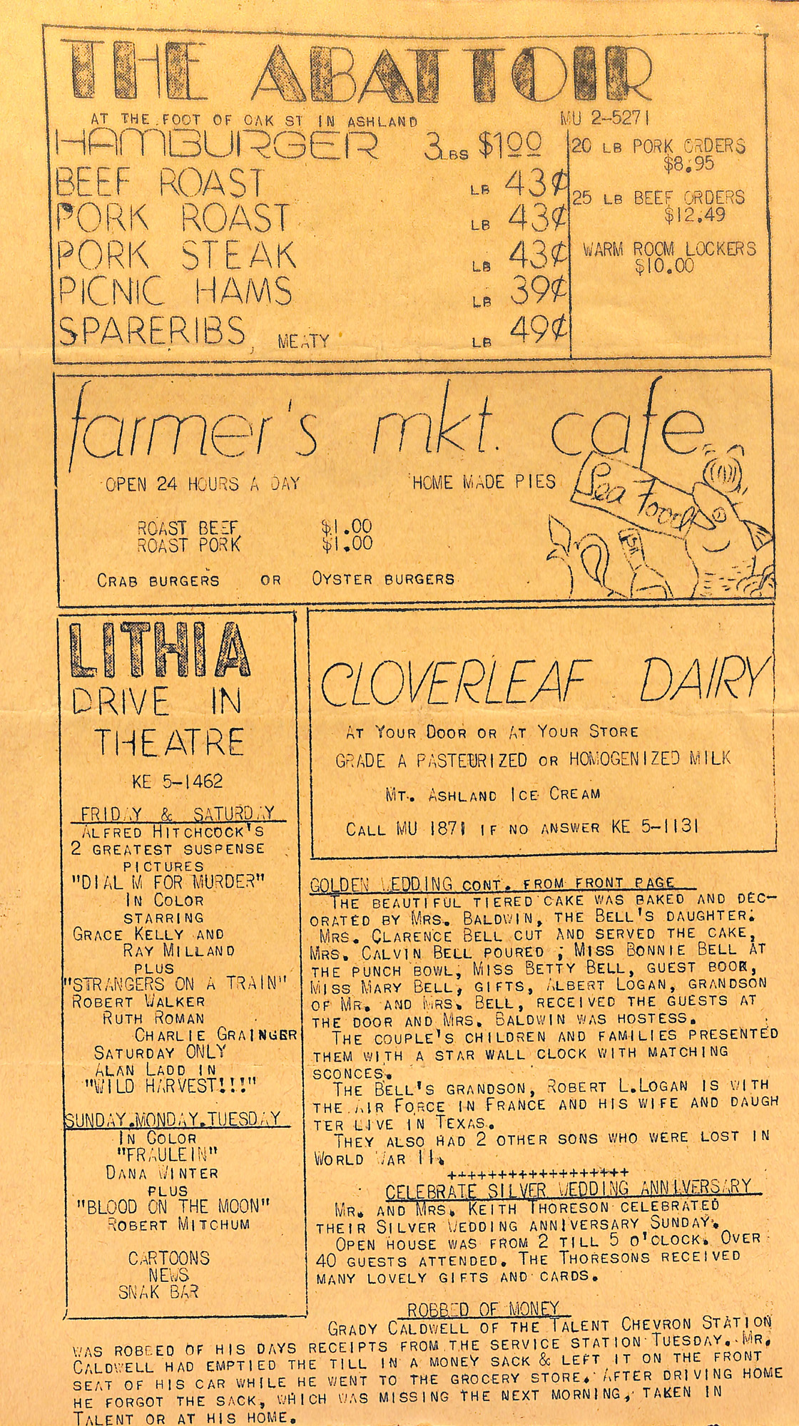 COUPLE CELEBRATE ANNIVERSARY Mr. and Mrs. Bert Bell of Talent held open house at their home Sunday, Nov. 27th in celebration of their Golden Wedding Anniversary. Sixty-four friends and relatives called during the afternoon to offer congratulations to the couple, who were showered with gifts and flowers. Mrs. Bell wore a blue figured dress and a beautiful corsage. Mr. and Mrs. Bell have spent all their married lives in Talent and Klamath Falls. Their guests included many old-time residents from various parts of the valley. Mr. Bell is the son of the late Mr. and Mrs. Jeff Bell, a pioneer family of the Rogue Valley. Mrs. Bell is the daughter of the late Mr. Henry Brinker and Mrs. Brinker, now 93 years old, of La Crosse, Wisc. Mr. and Mrs. Bell's children and families were present. The list included Mr. and Mrs. Clarence Bell and daughters Bonnie and Betty; Mr. and Mrs. Calvin Bell and children Virgil and Mary of Klamath Falls; Mr. and Mrs. John Baldwin and son Albert Logan of Talent. Out-of-town relatives were Mr. Bert Congdon of Galesville, Wisc., brother-in-law of Mrs. Bell; Mr. and Mrs. Wayland Smith of Yreka, Calif. Mrs. Smith is a cousin of Mrs. Bell. Mrs. Tom Bell of Jacksonville and many other relatives from the valley were present. Other guests from out of town were Merlyn Black of Livermore, Calif.; Mr. and Mrs. Harvey Copeland of Gold Hill. Mr. and Mrs. Bell were married Nov. 24th, 1910 in Ashland at the Presbyterian Church. Their four attendants for the wedding were Mr. and Mrs. Wilbur Kime, Mrs. Wayland Smith and Mr. Paul Quackenbush [who] helped celebrate their anniversary and were presented with flowers. Cont. on next page COMINGS AND GOINGS Mr. and Mrs. Rolly Hartley and children spent the Thanksgiving holidays with Mr. and Mrs. Russ Combest and children in Nevada. Mr. and Mrs. John Glover and daughter and Johnnie Butler were Thanksgiving dinner guests of the George Gleim family. John Butler left early Thanksgiving Day to spend the holidays with Nina. He reports she is much improved but will be in the clinic for several more weeks. Mr. and Mrs. Lawrence Burnette and Mr. and Mrs. Terry Burnette and children spent Thanksgiving with Mr. and Mrs. H.C. Burnette. Mr. and Mrs. Bill Reichstein and daughter were guests of the Wayne Reichsteins on Thanksgiving. HOME FROM SURGERY Mrs. Joe Fenton, Jr. returned home from the hospital Monday after undergoing surgery. SUCCESSFUL ELK HUNTERS RETURN Returning from the wilds with an elk apiece were Joe Fenton, Jr., Neil Stockebrand, Cy Combest and Ray Rapp. Other hunters bringing home an elk were Jiggs Conner & Geo. Conner. VOLUNTEER FIREMEN CALLED The fire whistle blew about 7:30 am Tuesday. A fire broke out in the kitchen of the Zickefoose house on Lapree and Old Pacific Hwy. It was soon brought under control in spite of the high wind by our efficient fire dept. WHEN THE BELLS RING SATURDAY GET OUT YOUR OLD AND BROKEN TOYS…THE CRATER LAKE CAMPFIRE GIRLS ARE COLLECTING FOR THE FIREMEN TO REPAIR THEM FOR NEEDY CHILDREN. GOLDEN WEDDING cont. from front page The beautiful tiered cake was baked and decorated by Mrs. Baldwin, the Bells' daughter. Mrs. Clarence Bell cut and served the cake, Mrs. Calvin Bell poured; Miss Bonnie Bell at the punch bowl, Miss Betty Bell, guest book, Miss Mary Bell, gifts, Albert Logan, grandson of Mr. and Mrs. Bell, received the guests at the door and Mrs. Baldwin was hostess. The couple's children and families presented them with a star wall clock with matching sconces. The Bells' grandson, Robert L. Logan, is with the Air Force in France and his wife and daughter live in Texas. They also had 2 other sons who were lost in World War II. CELEBRATE SILVER WEDDING ANNIVERSARY Mr. and Mrs. Keith Thoreson celebrated their Silver Wedding Anniversary Sunday. Open house was from 2 till 5 o'clock. Over 40 guests attended. The Thoresons received many lovely gifts and cards. ROBBED OF MONEY Grady Caldwell of the Talent Chevron Station was robbed of his day's receipts from the service station Tuesday. Mr. Caldwell had emptied the till in a money sack & left it on the front seat of his car while he went to the grocery store. After driving home he forgot the sack, which was missing the next morning, taken in Talent or at his home. Page 3, ads for: DRIVE-IN CLEANERS UPTOWN BARBERSHOP AL GRABHER'S MOBILE FEED SERVICE PHOENIX INTERCITY MARKET ARLIE'S TV REPAIR SERVICE FARMER'S INSURANCE--L.H. GALLATIN WILL the party who found the cocker spaniel please call KE 5-1421. WANT ADS, cont. FOR SALE--120 bass Galenti accordion in excellent condition--$100.00. 2-9-16 FOR SALE--One stuffed chair good condition--cheap…226 A Gibson FOR SALE--Dressed, grain-fed steers for your locker. Howard Work, Wagner Creek Road ATTEND THE BASKETBALL GAME TONIGHT