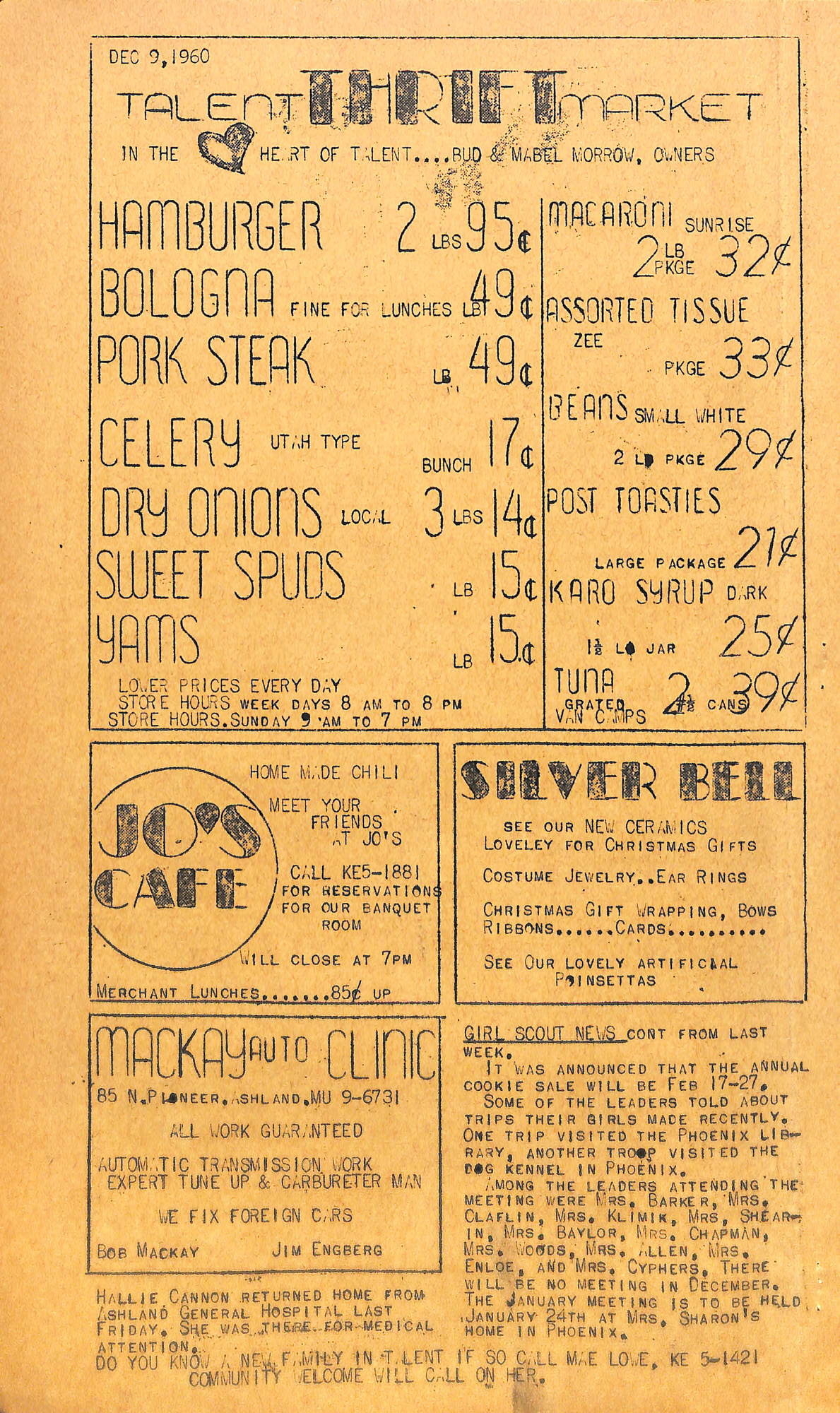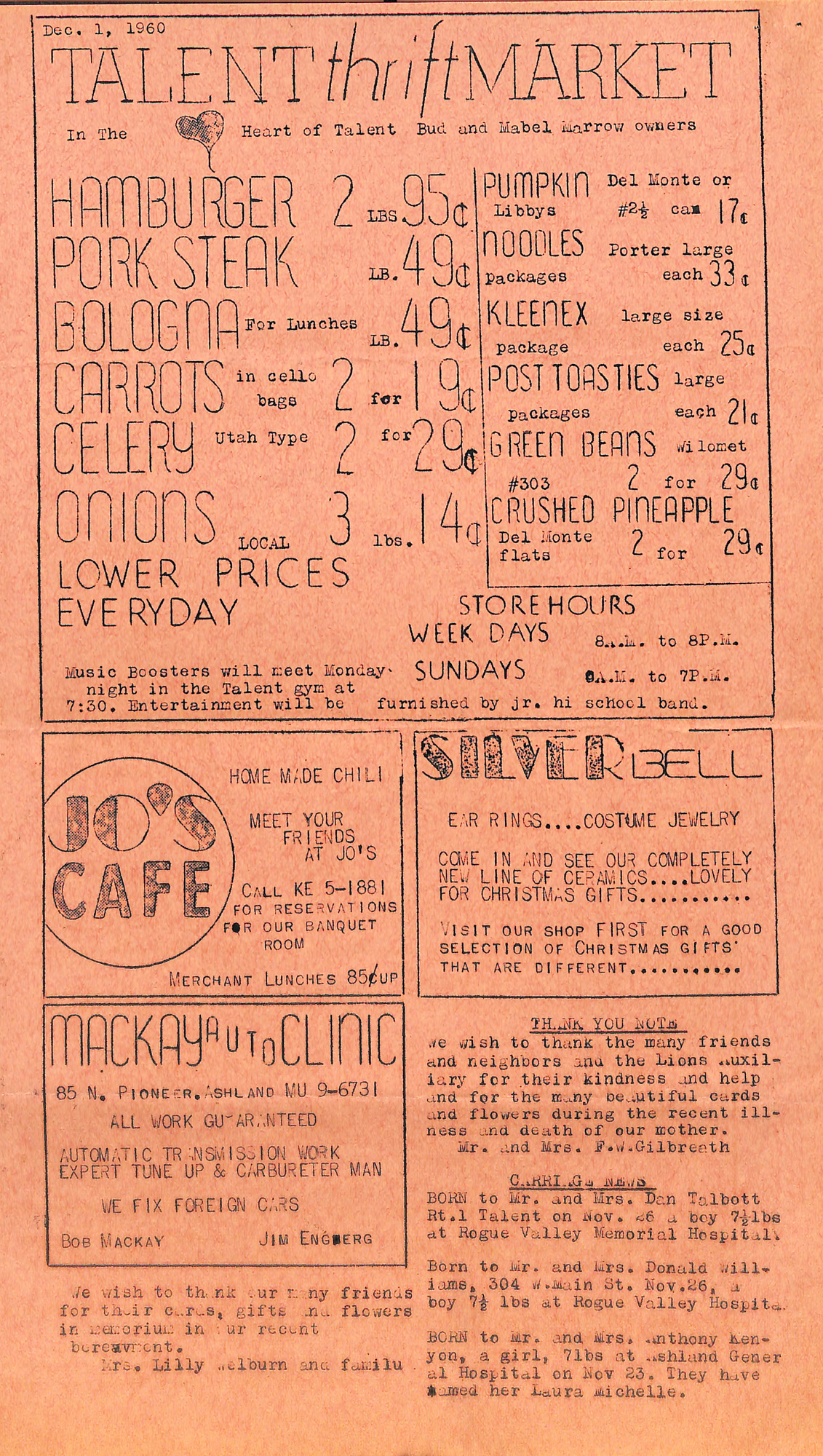 Page 4, ads for: TALENT THRIFT MARKET JO'S CAFÉ SILVER BELL GIFT SHOP--See our lovely artificial poinsettias MACKAY AUTO CLINIC GIRL SCOUT NEWS--cont. from last week. It was announced that the annual cookie sale will be Feb. 17-27. Some of the leaders told about trips their girls made recently. One trip visited the Phoenix library, another troop visited the dog kennel in Phoenix. Among the leaders attending the meeting were Mrs. Barker, Mrs. Claflin, Mrs. Klimek, Mrs. Shearin, Mrs. Baylor, Mrs. Chapman, Mrs. Woods, Mrs. Allen, Mrs. Enloe, and Mrs. Cyphers. There will be no meeting in December. The January meeting is to be held January 24th at Mrs. Sharon's home in Phoenix. Hallie Cannon returned home from Ashland General Hospital last Friday. She was there for medical attention. DO YOU KNOW A NEW FAMILY IN
