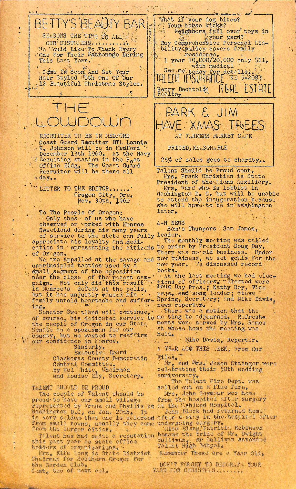 TO BE IN MEDFORDPage 6, full-page ad for: DRIVE-IN MARKET Page 7, ads for: BETTY'S BEAUTY BAR TALENT INSURANCE & REAL ESTATE PARK & JIM HAVE XMAS TREES At Farmer's Market Café; 25% of Sales Goes to Charity THE LOWDOWN Coast Guard Recruiter BTL Lonnie K. Johnson will be in Medford December 13th, 1960. At the Navy recruiting station in the Post Office Bldg. The Coast Guard recruiter will be there all day… LETTER TO THE EDITOR Oregon