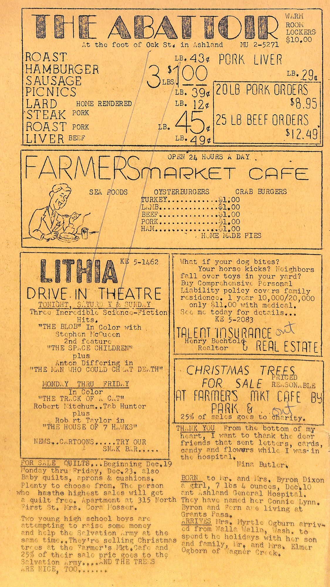 CHURCH TO HOLD PROGRAM The primary department of the Methodist Church will give a Christmas program in the annex at 10:00 am Sunday, Dec. 19th. Parents and friends are urged to attend. FALSE ALARMS The Talent Fire Department was called to Phoenix on a leaf fire and to the home of Walter Krug on Gibson St. with a fire in the attic. During the past 10 days, eight false alarms have been sent in. This is like wolf, wolf, then when a fire really occurs no one shows up. This practical joker who turns in these alarms should be apprehended and learn something about the seriousness of a fire. SKATING PARTY HELD The seventh graders gave a skating party Monday night at Ashland. They all had a good time, except Kathy Engberg who fell and is now at home with a sprained back. RECEIVE MEDICAL CARE George A. Kerby of Wagner Cr. entered the Osteopathic Hospital at Central Point Sunday morning for medical treatment. Also in the hospital from the Talent area is Mervin D. Burk, son of Mr. and Mrs. Russell A. Burk, Route 1, Box 32a, Talent. OPEN THURSDAYS!!!! By mistake the Talent News Flashes published in the Uptown Barbershop that the shop was closed Thursday. The Uptown Barbershop is open every day of the week except MONDAY. 4-Hers MEET The Phoenix Brusher Busters filled out their goals for the coming year and also the club program. A demonstration was given by the leader on how to mount specimens on cards. Refreshments were served and games were played. The meeting was held Nov. 19 at the home of Bill Bagley. The next meeting will be held Dec. 17th at the Garris Osborn home, at 8:00. This information was reported by Bill James, club reporter. Page 2, ads for: THE ABATTOIR FARMER'S MARKET CAFÉ LITHIA DRIVE-IN THEATER TALENT INSURANCE & REAL ESTATE CHRISTMAS TREES FOR SALE AT FARMER'S MARKET CAFÉ BY PARK THANK YOU--from the bottom of my heart, I want to thank the dear friends that sent letters, cards, candy and flowers while I was in the hospital. Nina
